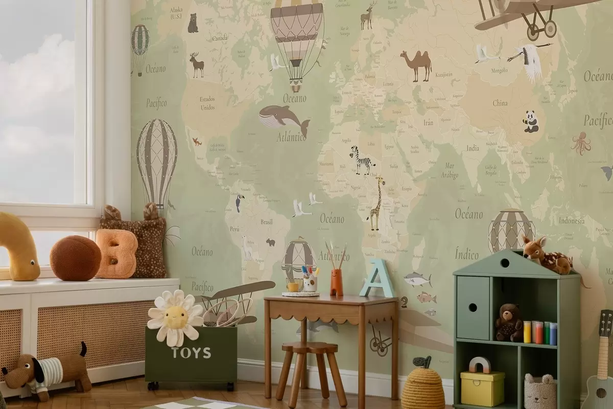 Fototapetai Vaikų pasaulio žemėlapis su gyvūnais, lėktuvais ir oro balionais. Ispanų kalba. Žalia spalva. Nr. c00003esv2