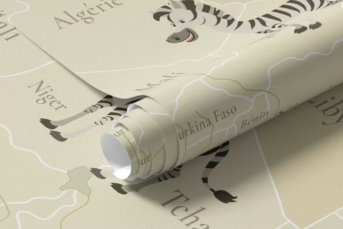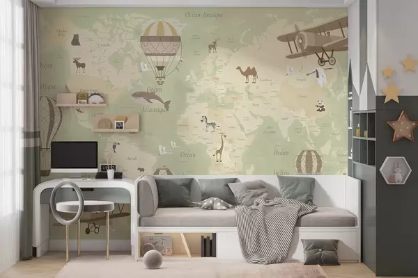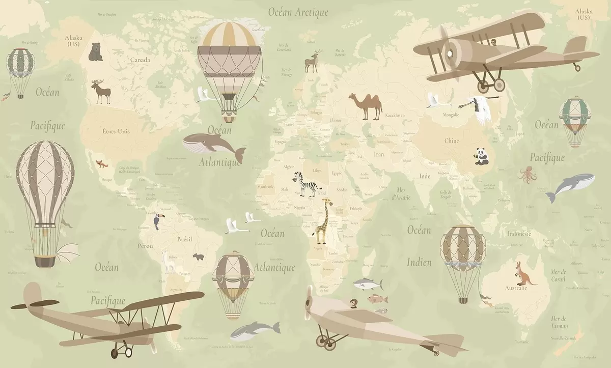 Fototapetai Vaikų pasaulio žemėlapis su gyvūnais, lėktuvais ir oro balionais. Prancūzų kalba. Žalia spalva. Nr. c00003frv2