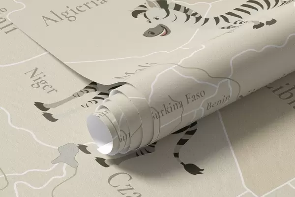 Fototapetai Vaikų pasaulio žemėlapis su gyvūnais, lėktuvais ir oro balionais. Lenkų kalba. Smėlio spalvos Nr. c00003pl