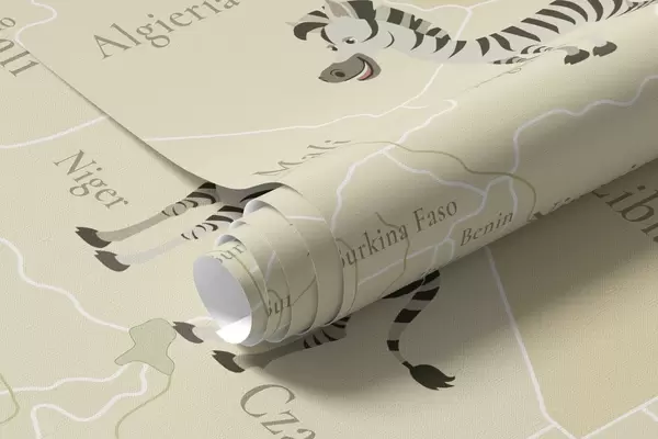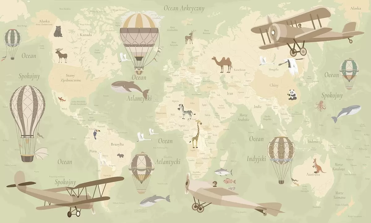 Fototapetai Vaikų pasaulio žemėlapis su gyvūnais, lėktuvais ir oro balionais. Lenkų kalba. Žalia spalva. Nr. c00003plv2
