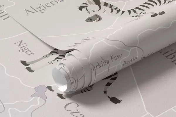 Fototapetai Vaikų pasaulio žemėlapis su gyvūnais, lėktuvais ir oro balionais. Lenkų kalba. Violetinė spalva. Nr. c00003plv4