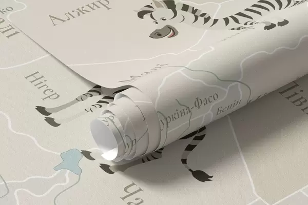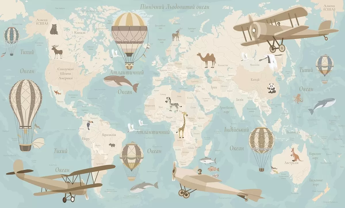 Fototapetai Vaikų pasaulio žemėlapis su gyvūnais, lėktuvais ir oro balionais. Ukrainiečių kalba. Mėlyna spalva. Nr. c00003ukv1
