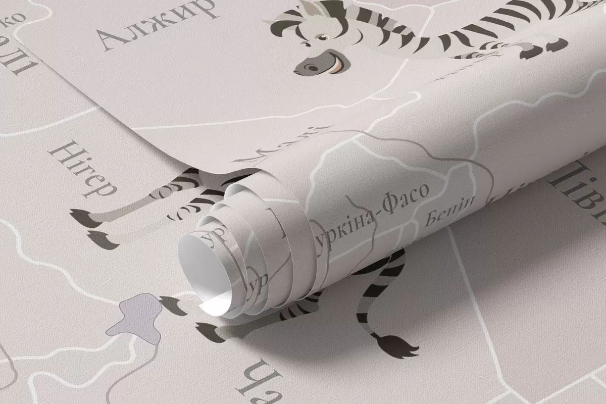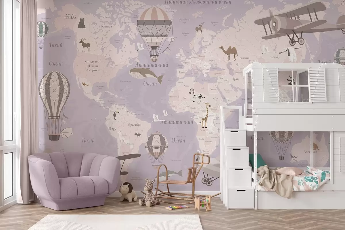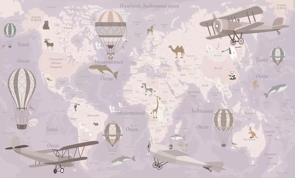 Fototapetai Vaikų pasaulio žemėlapis su gyvūnais, lėktuvais ir oro balionais. Ukrainiečių kalba. Violetinė spalva. Nr. c00003ukv4
