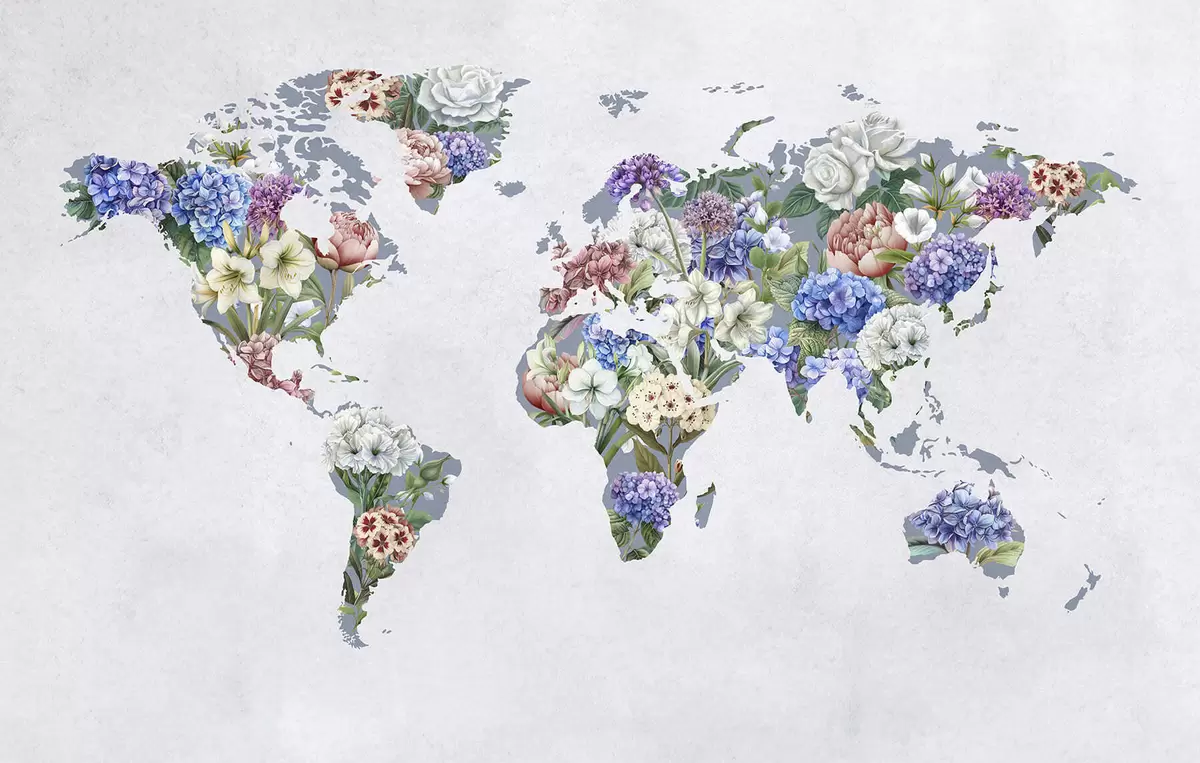 Fototapetai Spalvingas pasaulio žemėlapis, sudarytas iš įvairių ryškių gėlių Nr. c00006