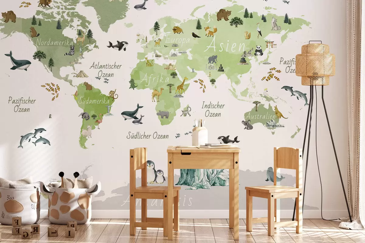 Fototapetai Akvarelės stiliaus žalia žemėlapis, kuriame pavaizduoti gyvūnai, augalai ir architektūros objektai. Užrašai vokiečių kalba Nr. c00009dev2