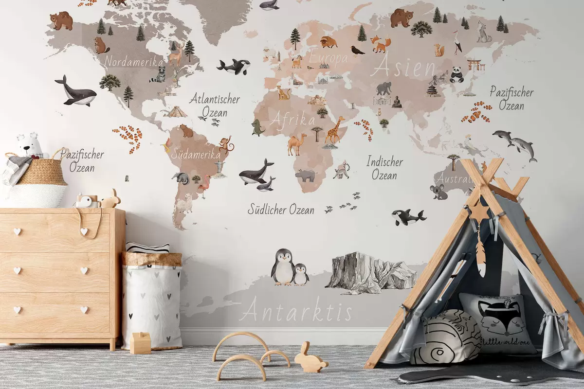 Fototapetai Akvarelės stiliaus smėlio spalvos žemėlapis, kuriame pavaizduoti gyvūnai, augalai ir architektūros objektai. Užrašai vokiečių kalba Nr. c00009dev3