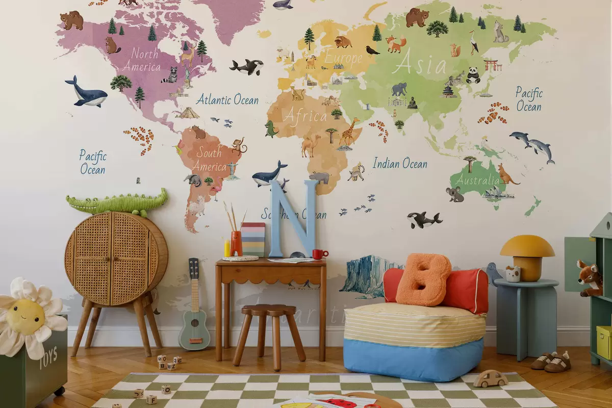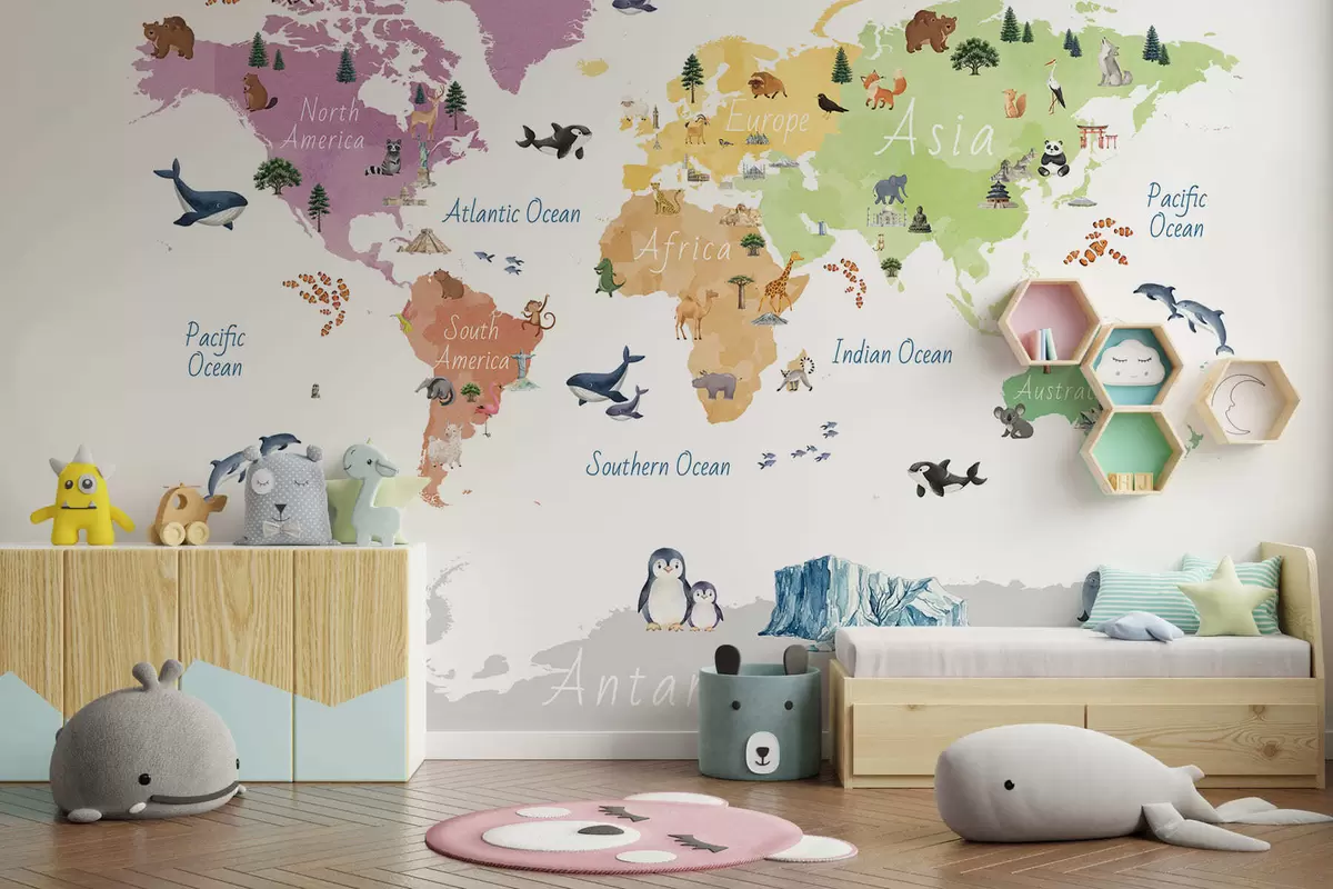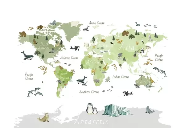 Fototapetai Akvarelės stiliaus spalvotas žemėlapis, kuriame pavaizduoti gyvūnai, augalai ir architektūros objektai. Antraštės anglų kalba Nr. c00009en