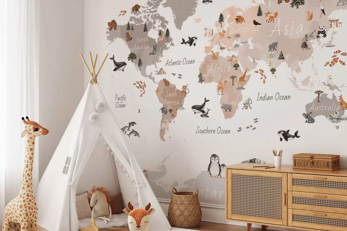 Fototapetai Akvarelės stiliaus smėlio spalvos žemėlapis, kuriame pavaizduoti gyvūnai, augalai ir architektūros objektai. Užrašai anglų kalba Nr. c00009env3