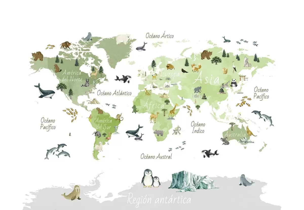 Fototapetai Akvarelės stiliaus žalia žemėlapis, kuriame pavaizduoti gyvūnai, augalai ir architektūros objektai. Užrašai ispanų kalba Nr. c00009esv2