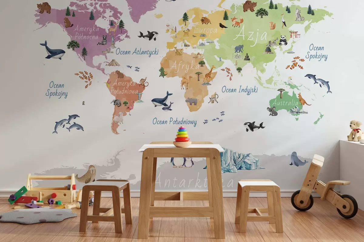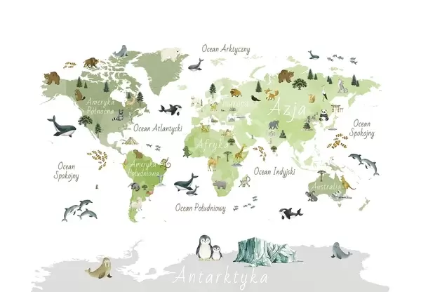Fototapetai Akvarelės stiliaus spalvotas žemėlapis, kuriame pavaizduoti gyvūnai, augalai ir architektūros objektai. Užrašai lenkų kalba Nr. c00009pl