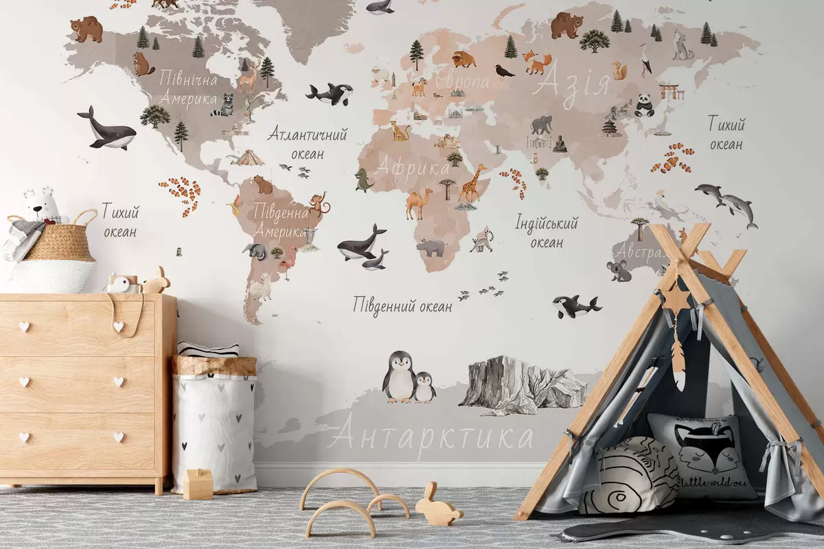 Fototapetai Akvarelės stiliaus smėlio spalvos žemėlapis, kuriame pavaizduoti gyvūnai, augalai ir architektūros objektai. Užrašai ukrainiečių kalba Nr. c00009ukv3