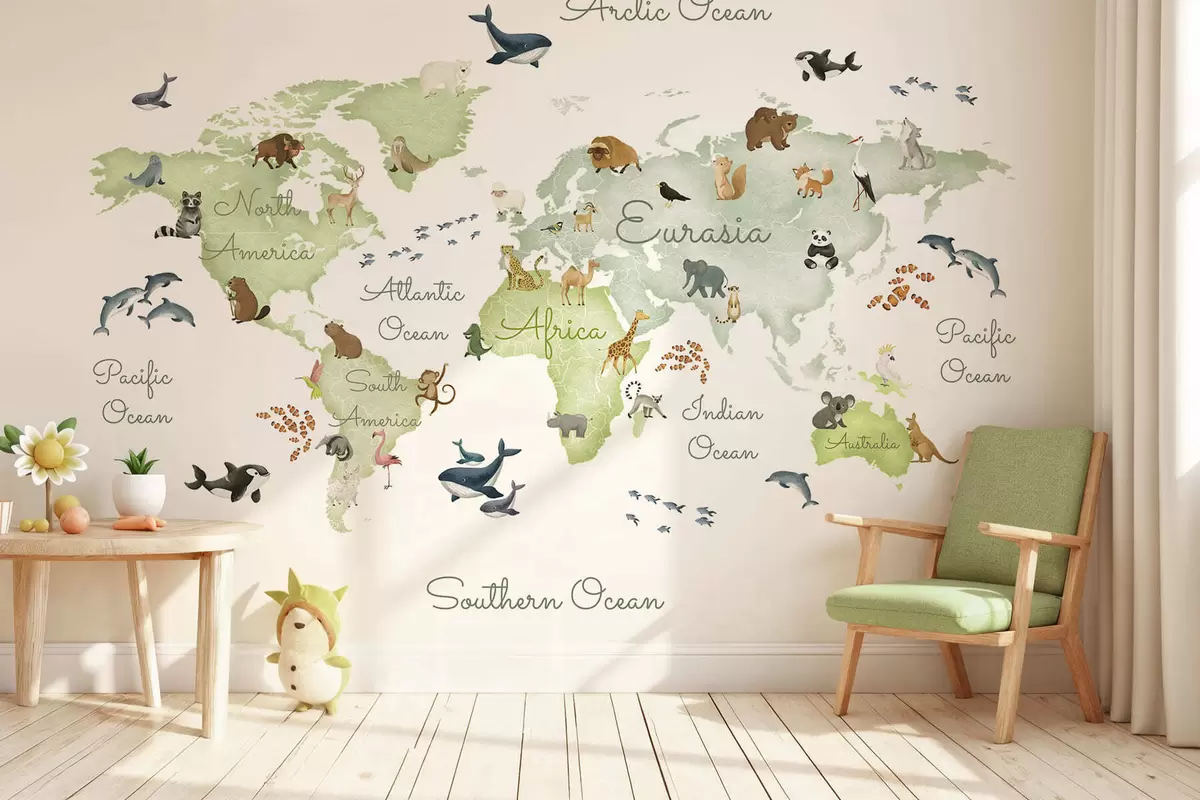 Fototapetai Akvarelės stiliaus žalia žemėlapis su gyvūnais. Užrašai anglų kalba Nr. c00012env2