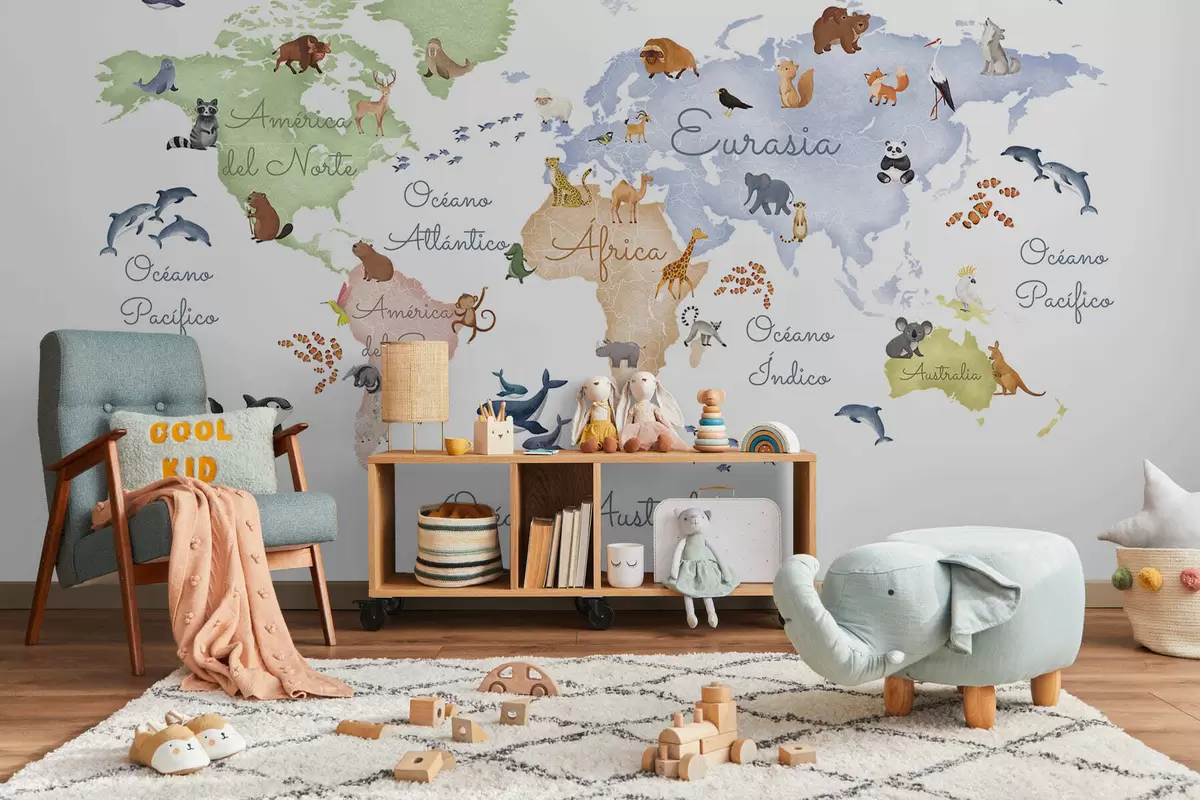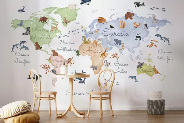 Fototapetai Akvarelės stiliaus spalvotas žemėlapis su gyvūnais. Užrašai ispanų kalba Nr. c00012es