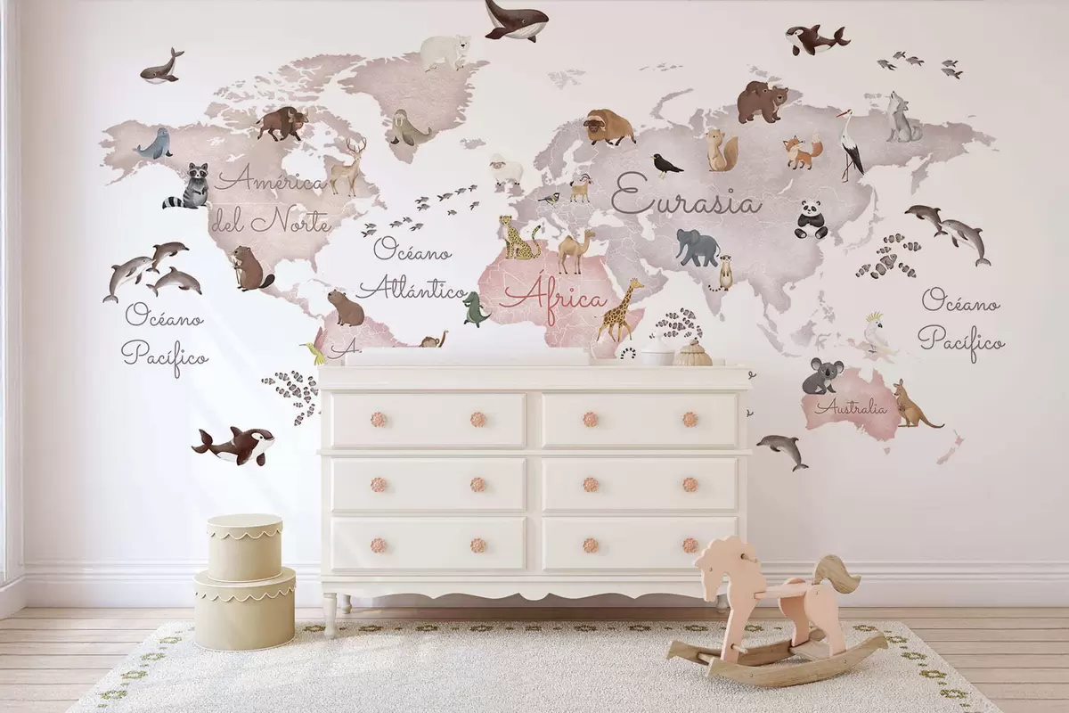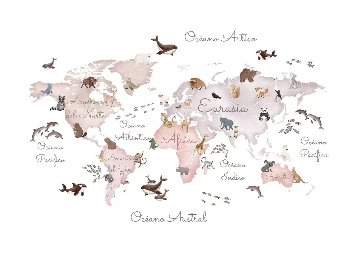 Fototapetai Akvarelės stiliaus smėlio spalvos žemėlapis su gyvūnais. Pavadinimai ispanų kalba Nr. c00012esv3