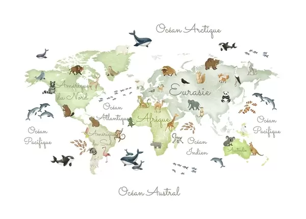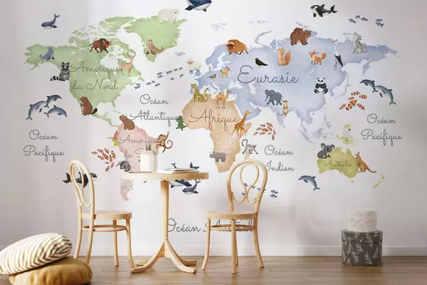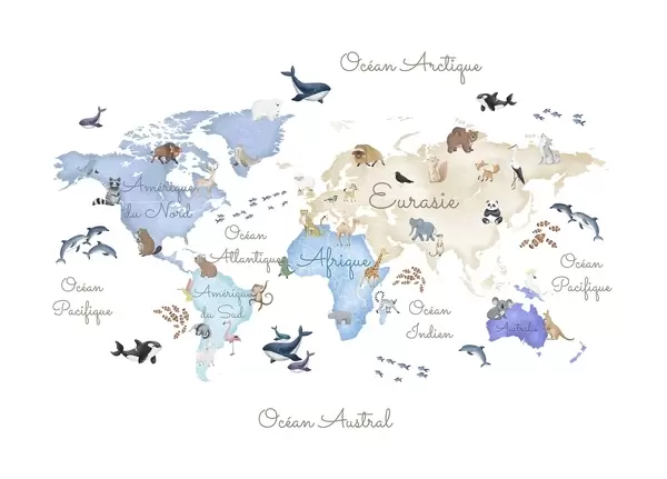 Fototapetai Akvarelės stiliaus spalvotas žemėlapis su gyvūnais. Užrašai prancūzų kalba Nr. c00012fr