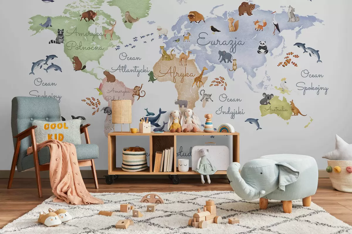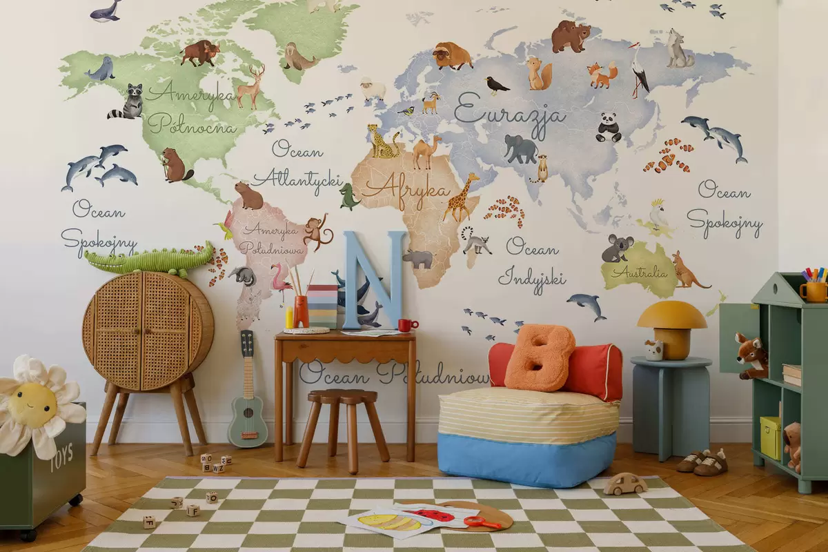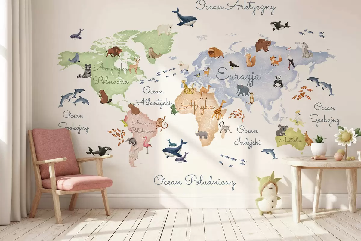 Fototapetai Akvarelės stiliaus spalvotas žemėlapis su gyvūnais. Antraštės lenkų kalba Nr. c00012pl