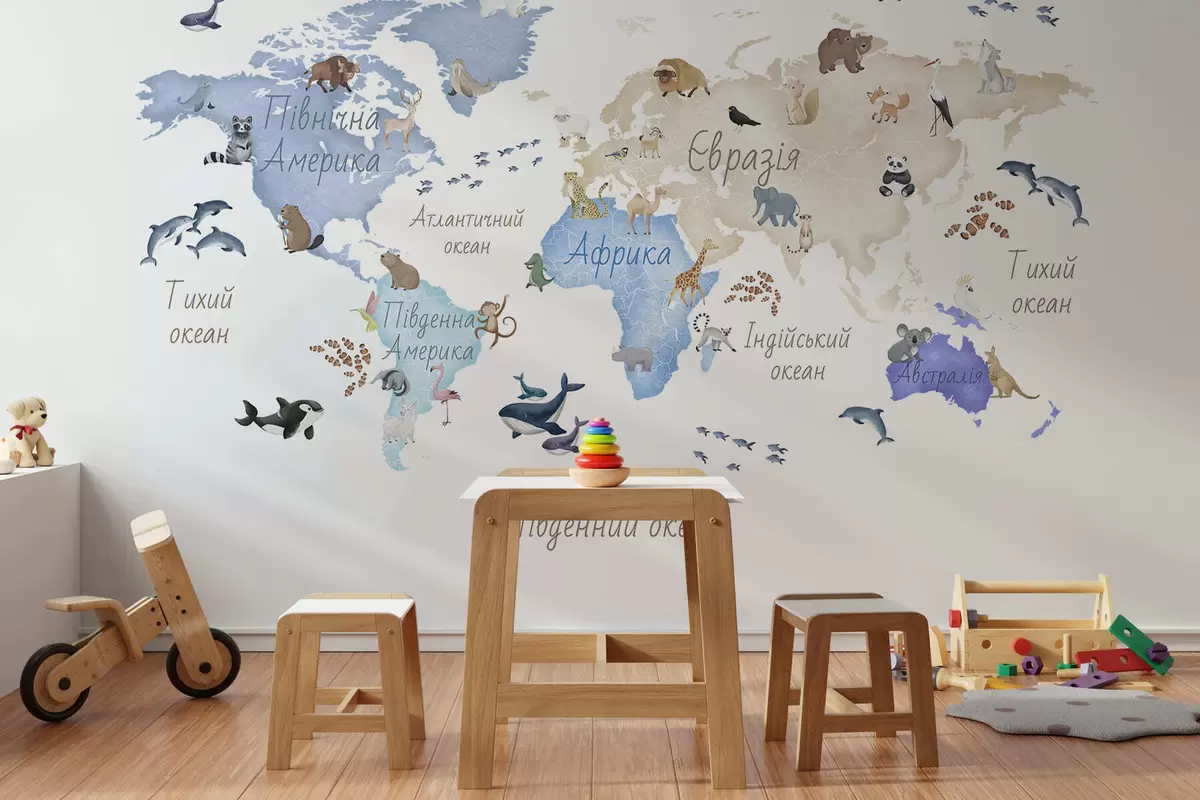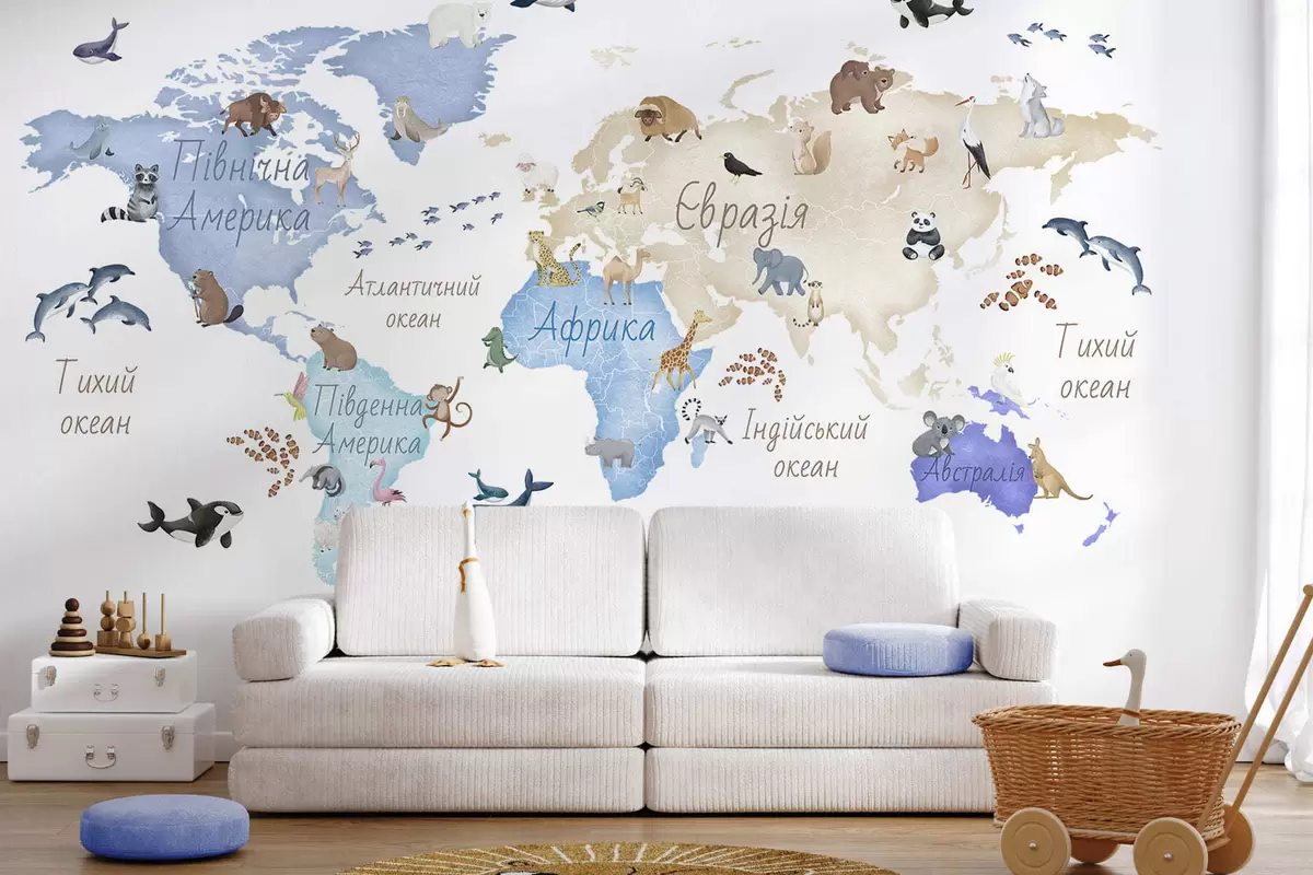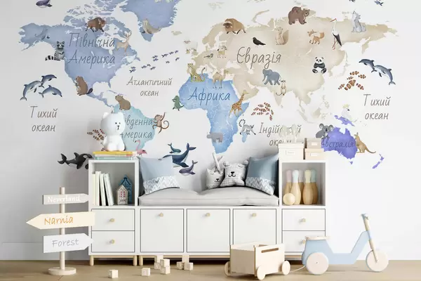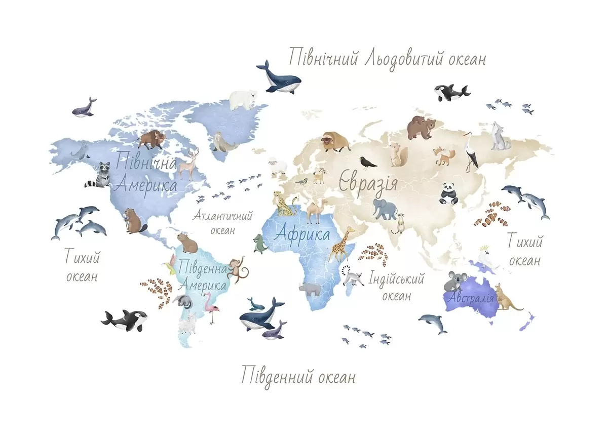 Fototapetai Akvarelinio stiliaus mėlynas žemėlapis su gyvūnais. Užrašai ukrainiečių kalba Nr. c00012ukv1