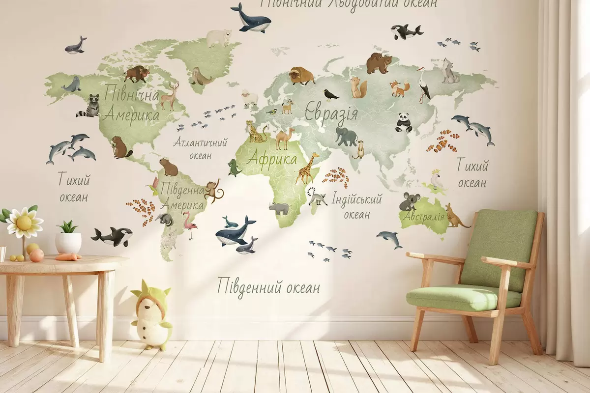 Fototapetai Akvarelinio stiliaus žalia žemėlapis su gyvūnais. Užrašai ukrainiečių kalba Nr. c00012ukv2