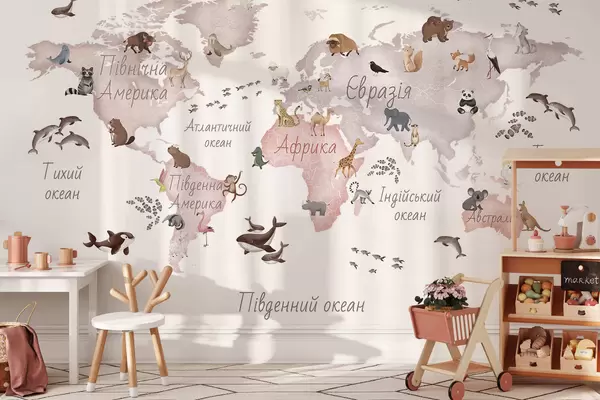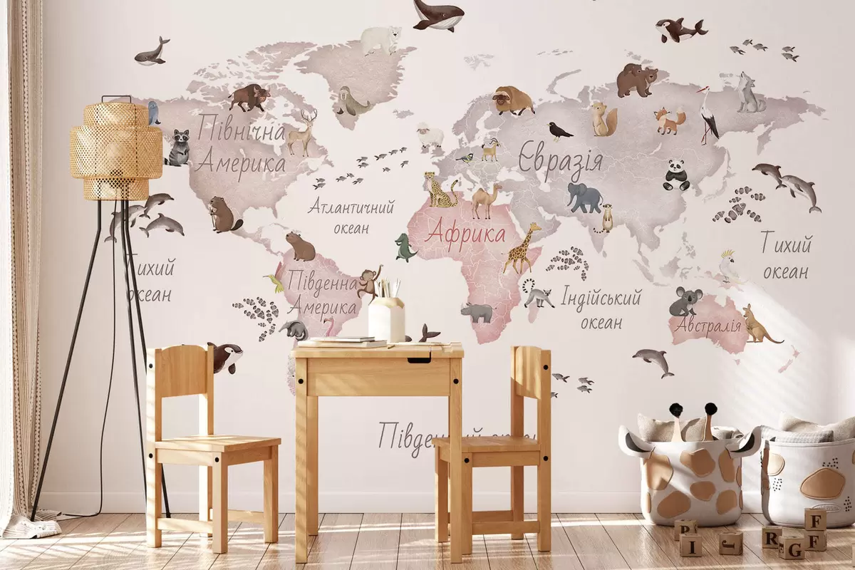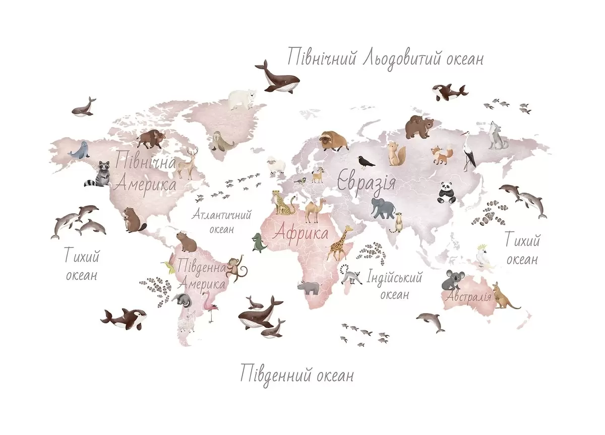 Fototapetai Akvarelinio stiliaus smėlio spalvos žemėlapis su gyvūnais. Pavadinimai ukrainiečių kalba Nr. c00012ukv3