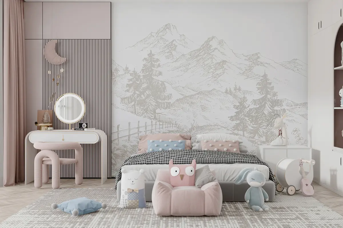 Fototapetai Kalnų kraštovaizdis, linijinis piešinys, medžiai, minimalizmas, smėlio spalvos Nr. u99572