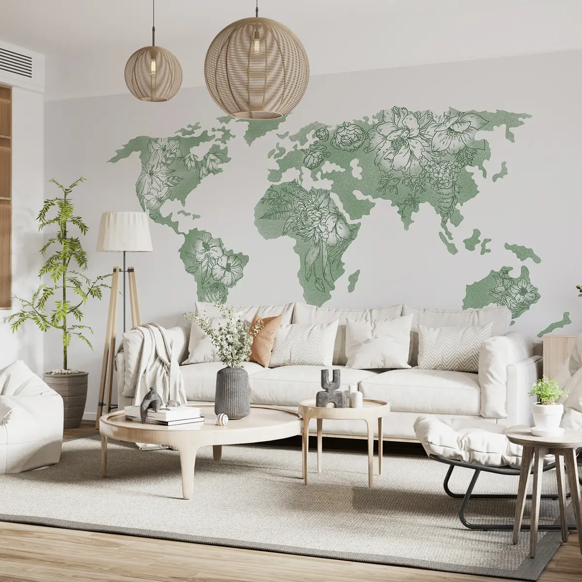 Fototapetai Gėlių pasaulio žemėlapis, dekoratyvinis, bijūnai, lelija, žalia spalva, linijų piešimo menas Nr. u99734v3