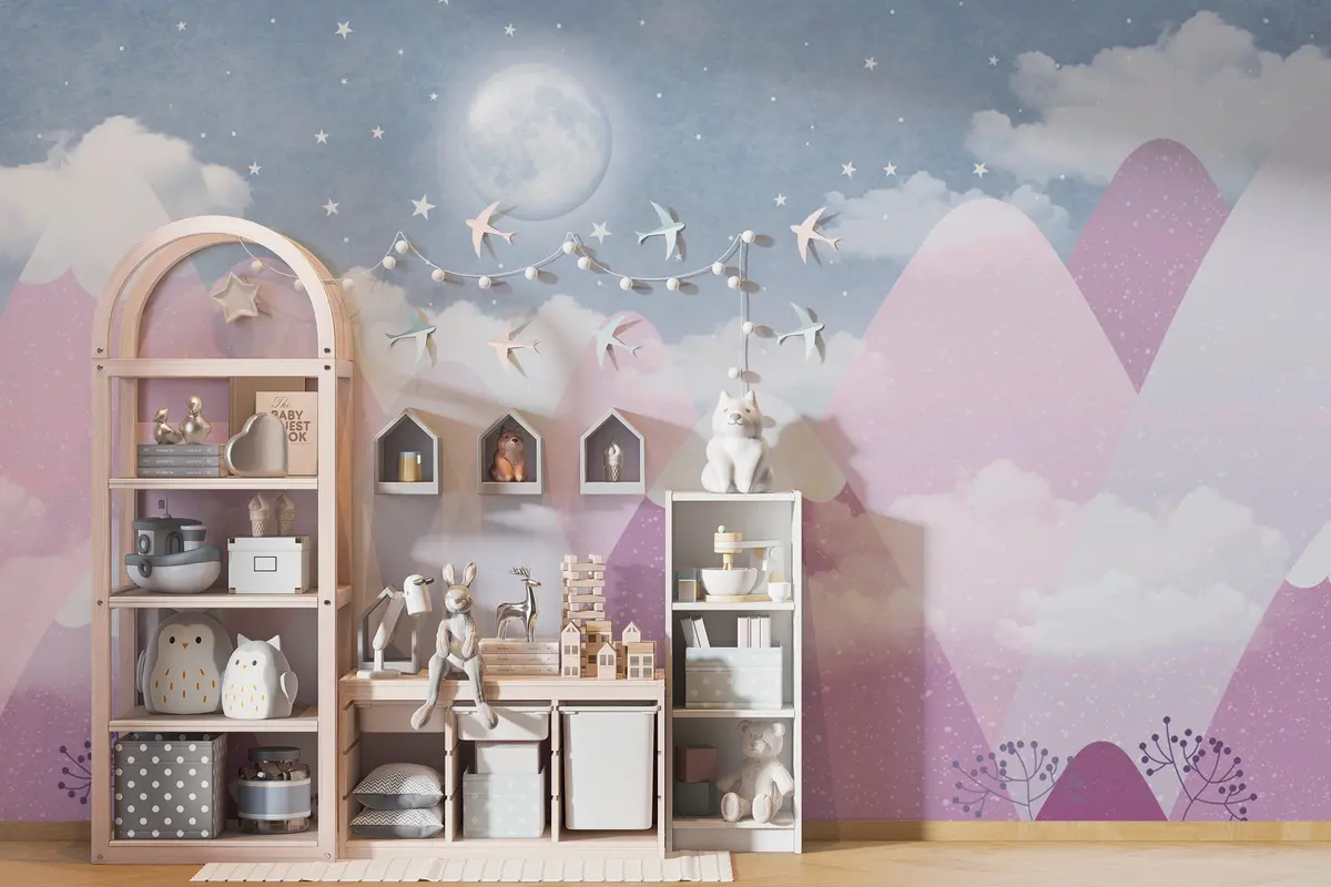 Fototapetai Mėnulis virš snieguotų kalnų mėlyna vaikiška iliustracija Nr. w00374v1