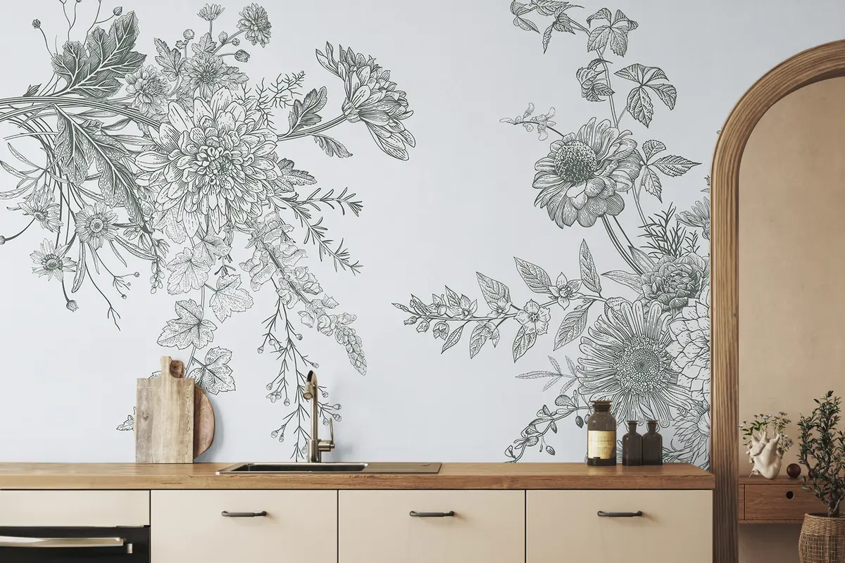 Fototapetai Gėlių ornamentas, minimalizmas, linijų menas, boho stilius, kaimiškas, bijūnas, margučiai, mėlynos spalvos, pieva Nr. w00381v3