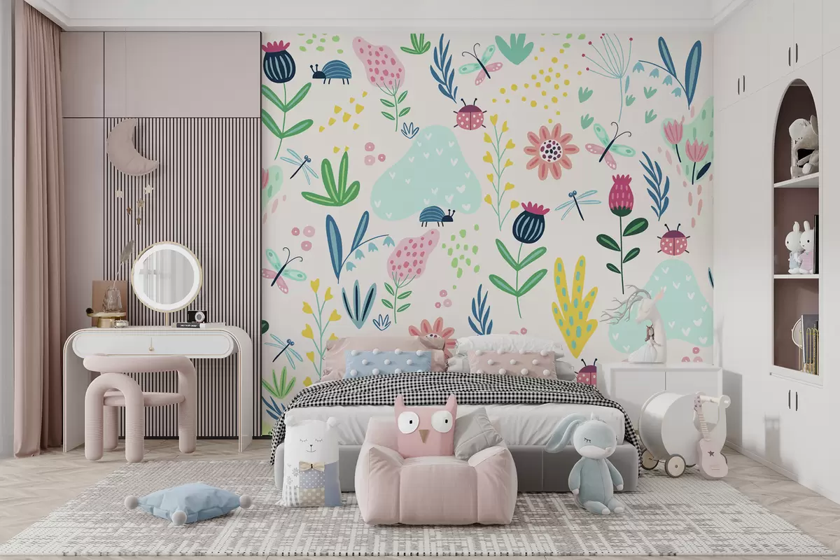 Fototapetai gėlės, drugeliai, laumžirgiai, boružėlės, kūdikio kambarys Nr. w00554