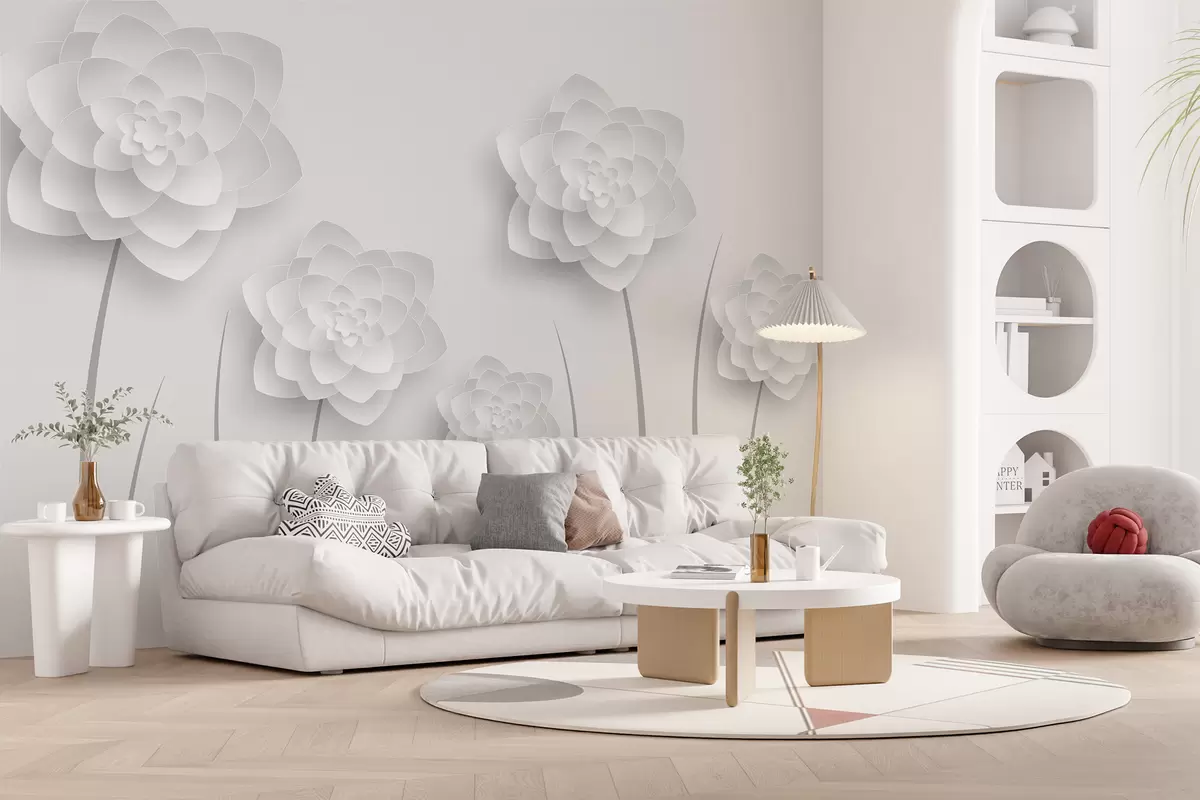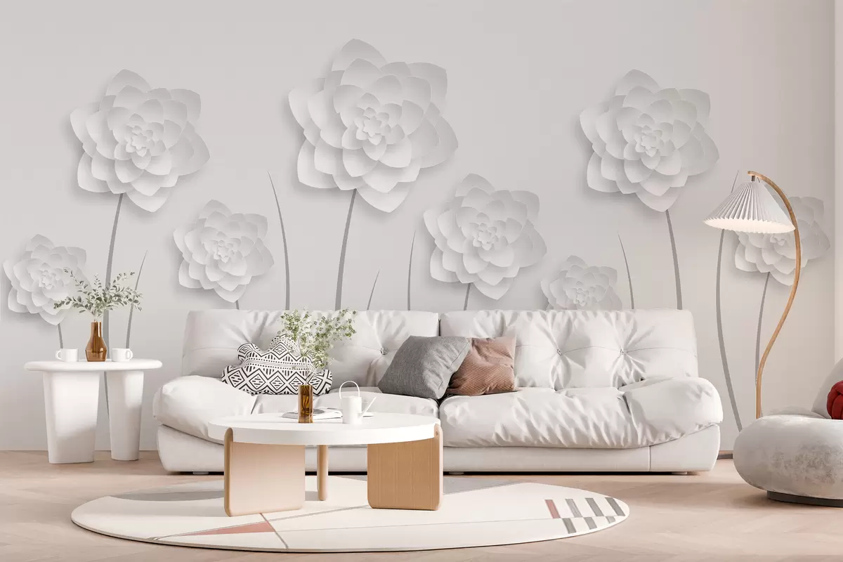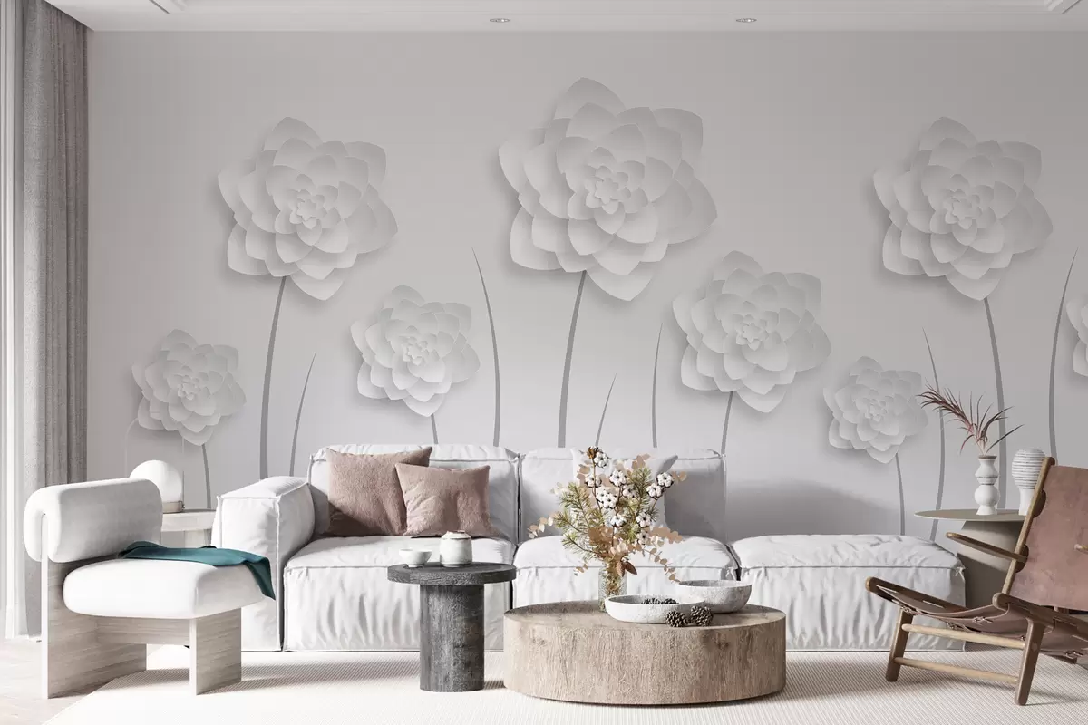 Fototapetai Didelės gėlės su tūrio imitacija popieriniu stiliumi šviesiai pilkame fone su pilku stiebu Nr. w01021