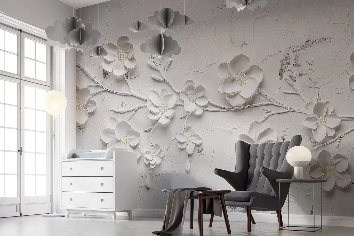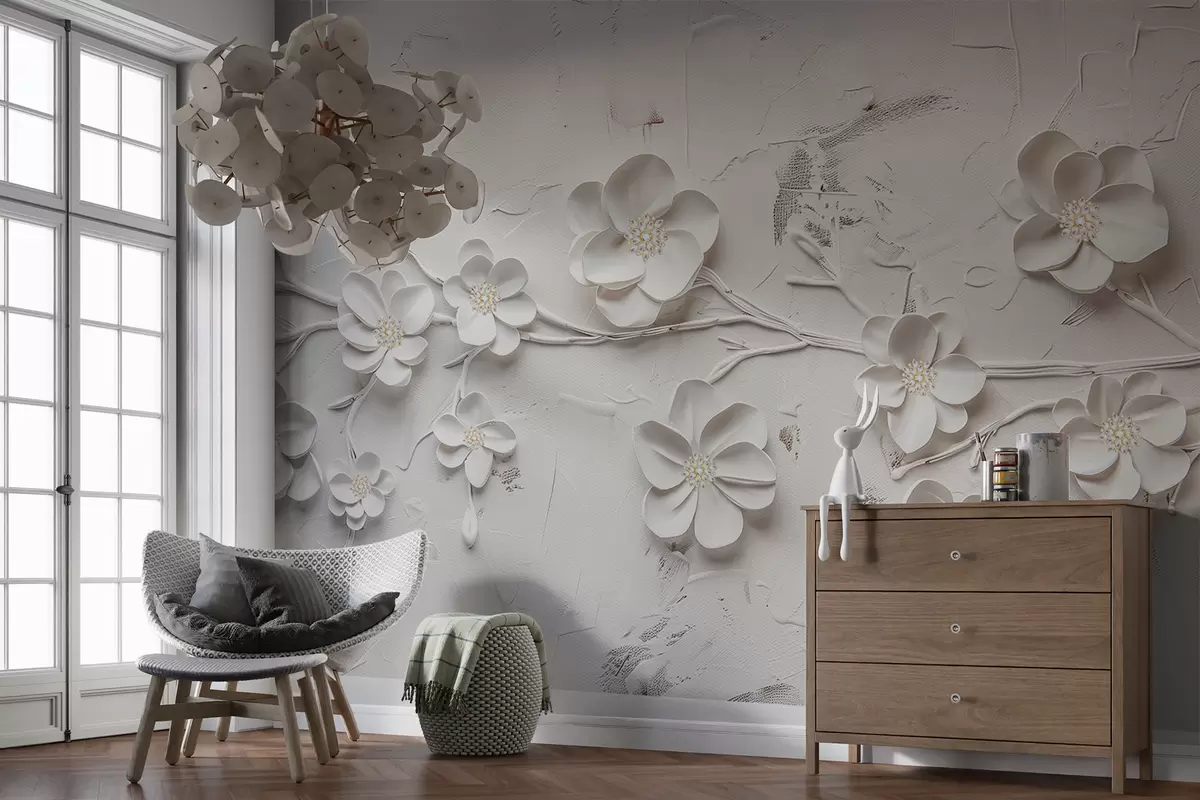 Fototapetai Baltas tekstūruotas fonas su 3D baltomis gėlėmis, žydinčiomis, sujungtomis šakomis, minimalistinis ir elegantiškas Nr. w01226