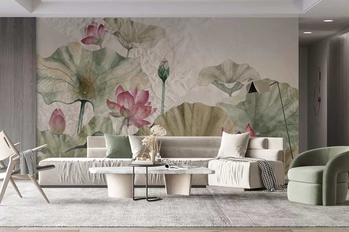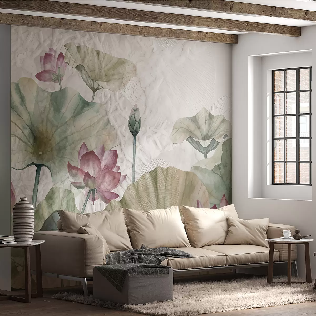 Fototapetai Rožinės lotoso gėlės su žaliais lapais šviesios tekstūros fone Nr. w01248