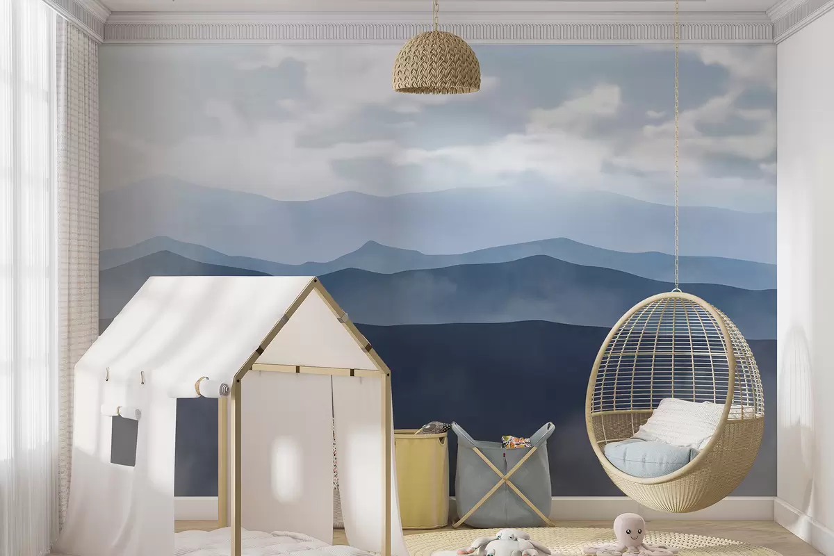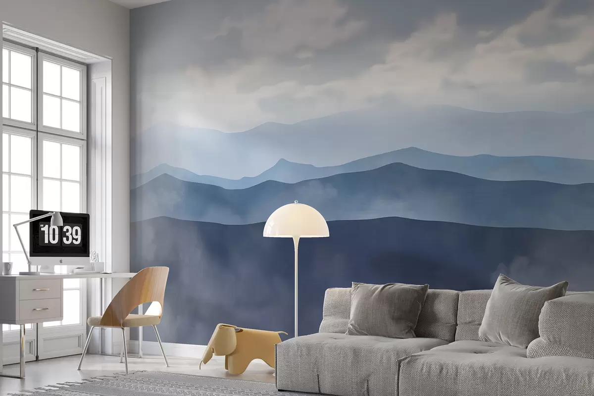 Fototapetai Miglotas minimalizmo kalnų peizažas su kalvotomis kalvomis ir debesuotu dangumi Nr. w01317