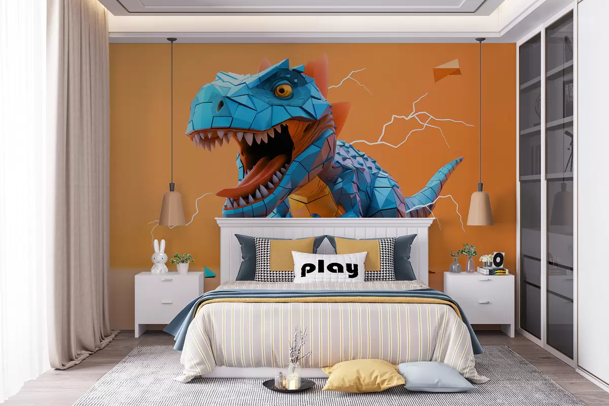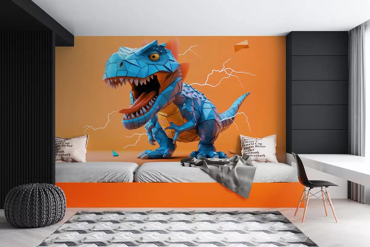 Fototapetai Nuožmus dinozauras su žaibo smūgiu geltonomis ir mėlynomis spalvomis Nr. w01333v1