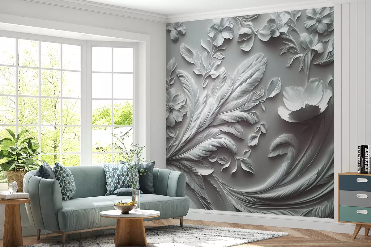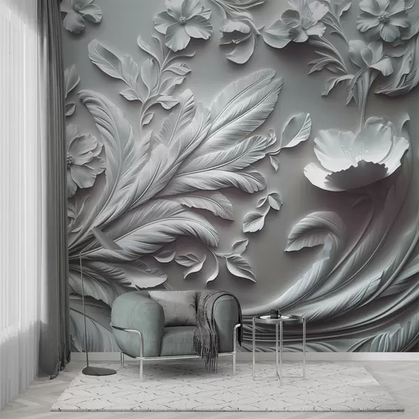 Fototapetai Išskirtinės iškilusios gėlės ir lapai pilkais tonais Nr. w01356v2
