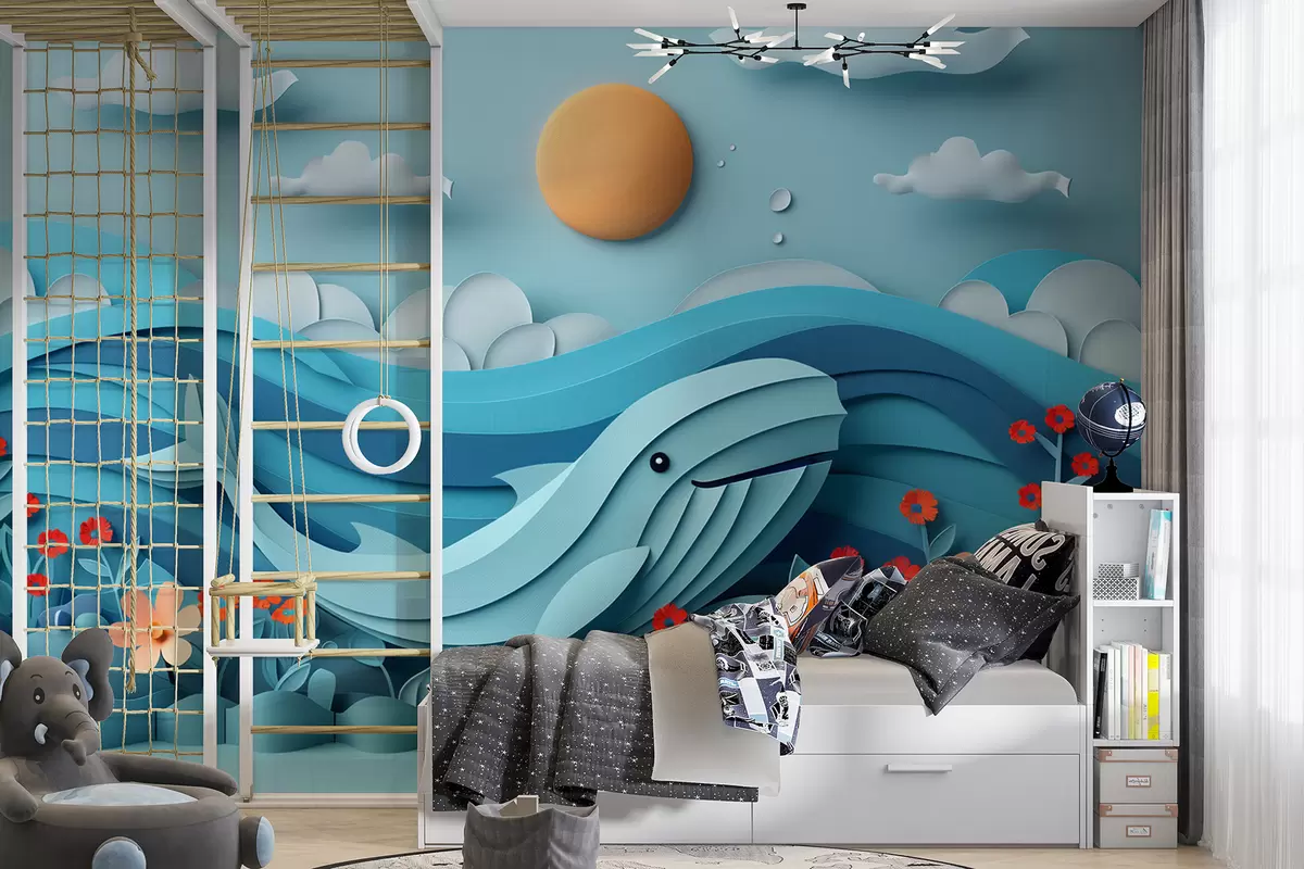 Fototapetai Iš popieriaus iškirptas mielas banginis mėlyname fone Nr. w01430