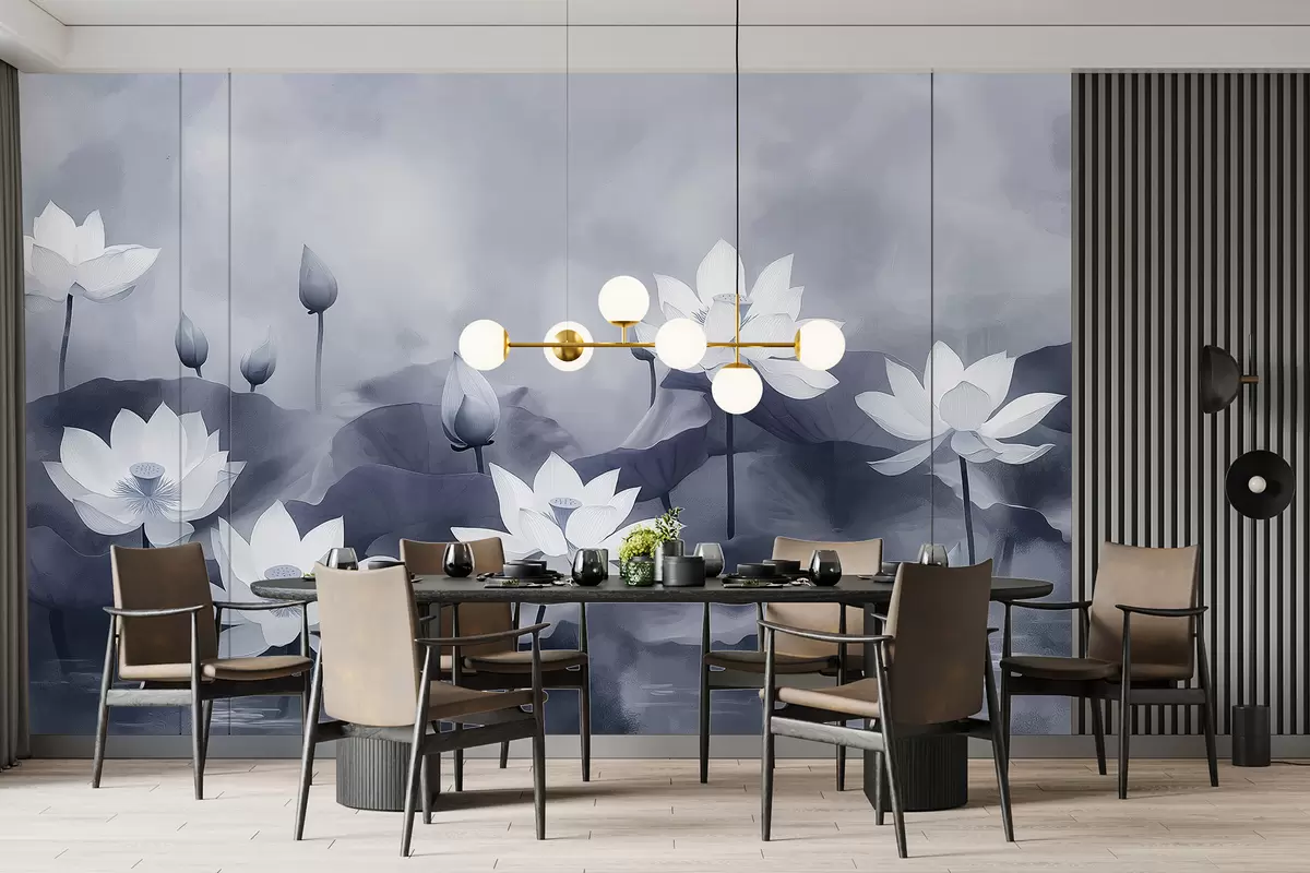 Fototapetai Lotosai ežere, gamta, rūkas, akrilo piešinys, dideli lapai, džiunglės, švelnios pilkos spalvos Nr. w01450v1