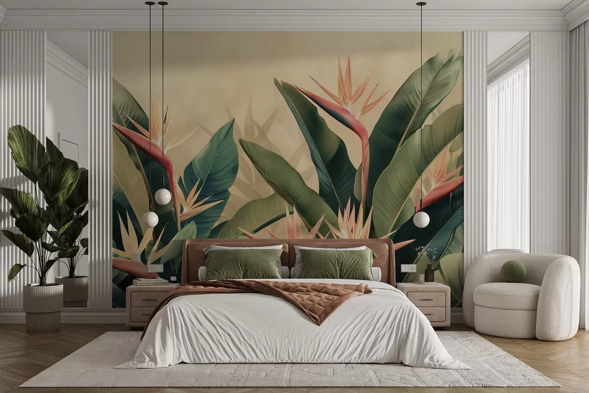 Fototapetai Sodrus tropinių gėlių išdėstymas, apsuptas didelių tamsiai žalių lapų Nr. w01484v1