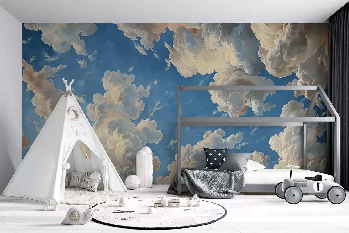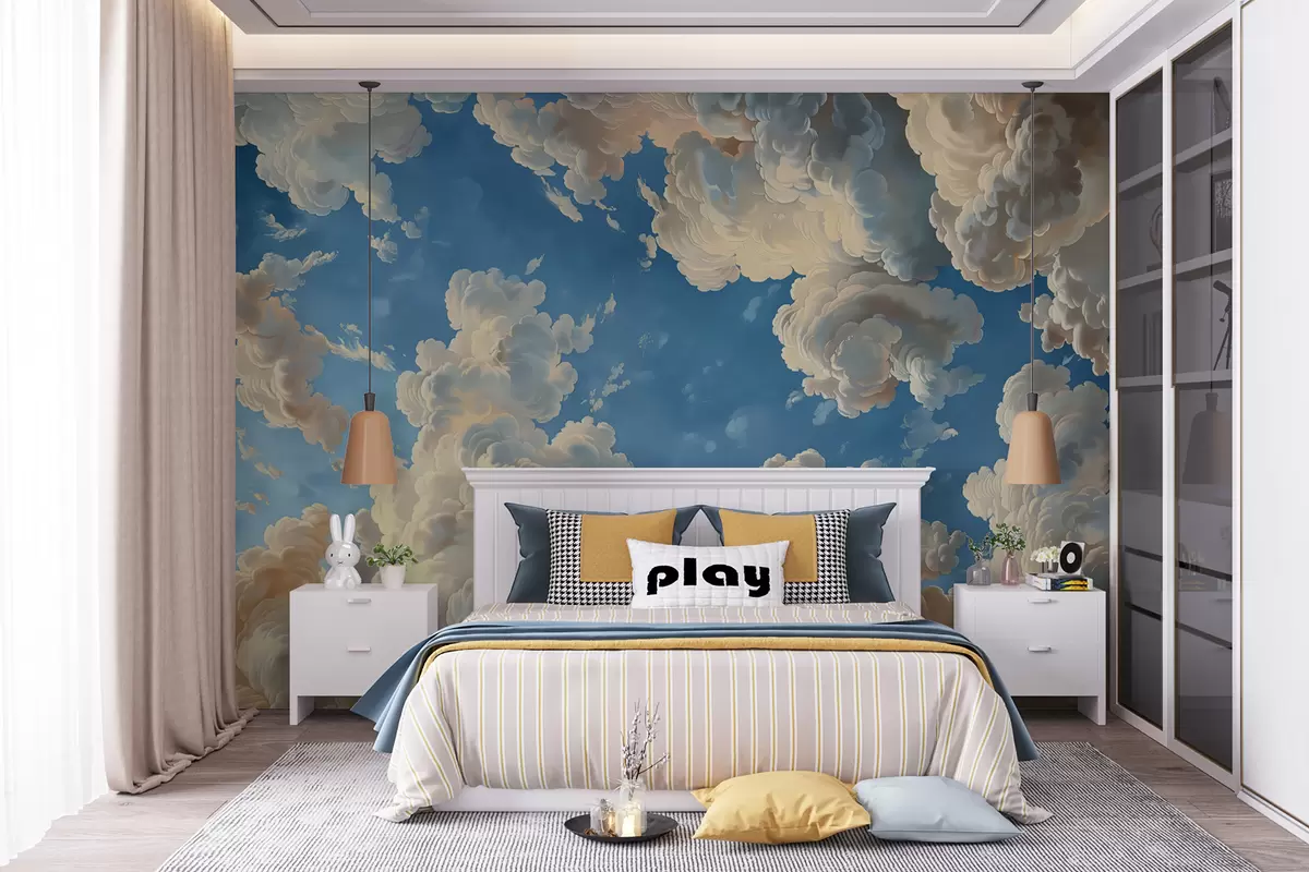 Fototapetai Šiltų kreminės, švelnios persikų ir šviesiai spalvų debesys, besipuikuojantys ant gilaus, ryškiai mėlyno dangaus Nr. w01583