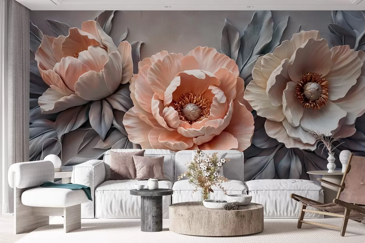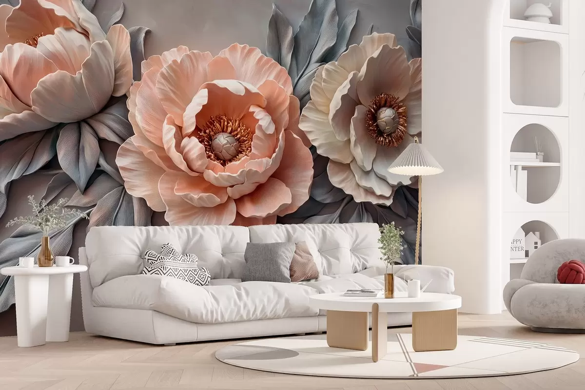 Fototapetai Gėlių rožiniai bijūnai su prislopintų pastelinių spalvų lapais ir žiedlapiais, skulptūrinio bareljefo stilius Nr. w01824