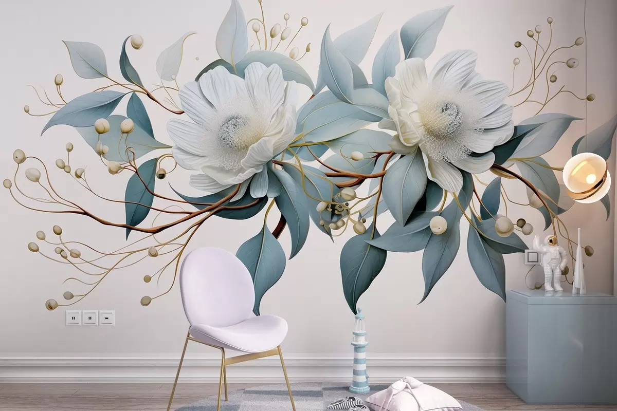 Fototapetai Gražios akrilo gėlės su lapais ir uogomis, realizmas Nr. w01887