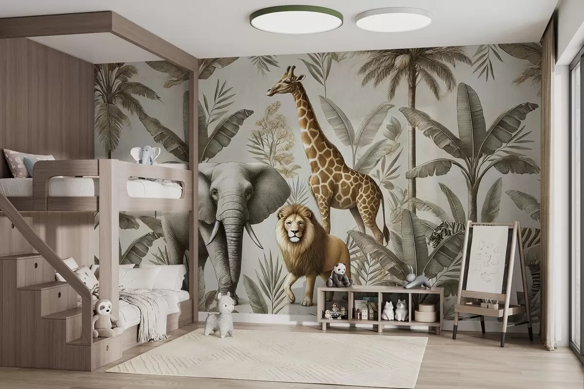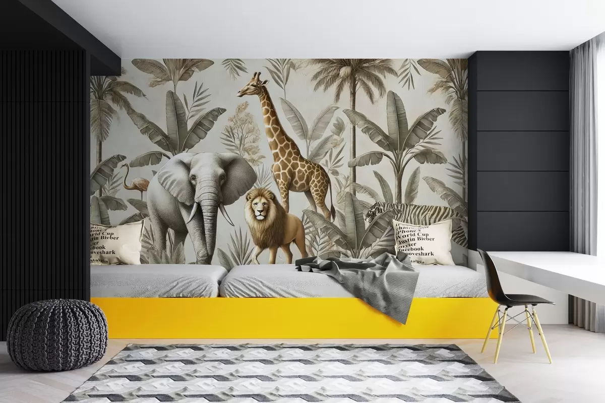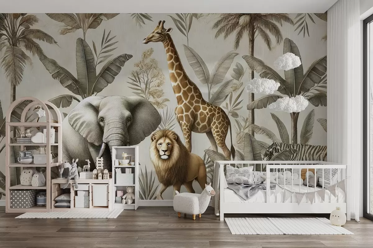 Fototapetai Safari vaikų tapetai su atogrąžų kraštovaizdžiu ir įvairiais gyvūnais elegantiškomis spalvomis Nr. w01956