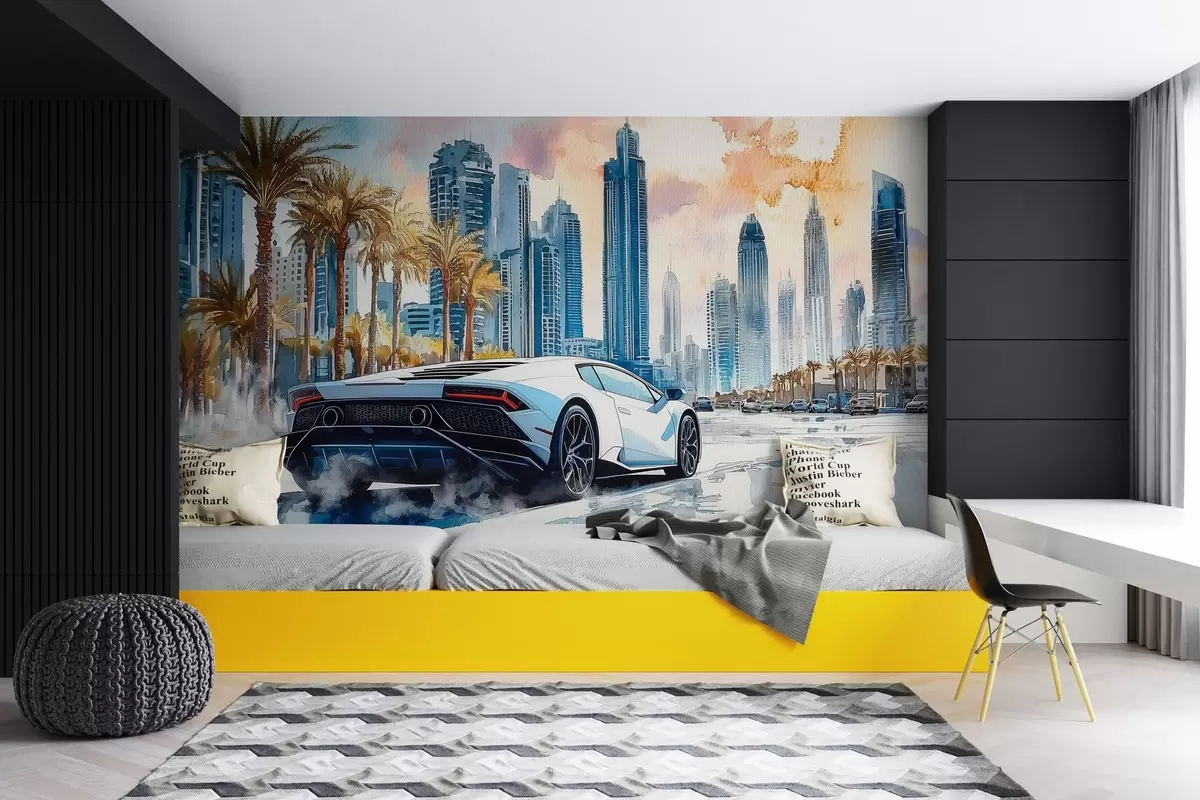 Fototapetai Baltas modernus sportinis automobilis lenktyniauja palmių ir dangoraižių fone laisva akvarelės technika Nr. w01963