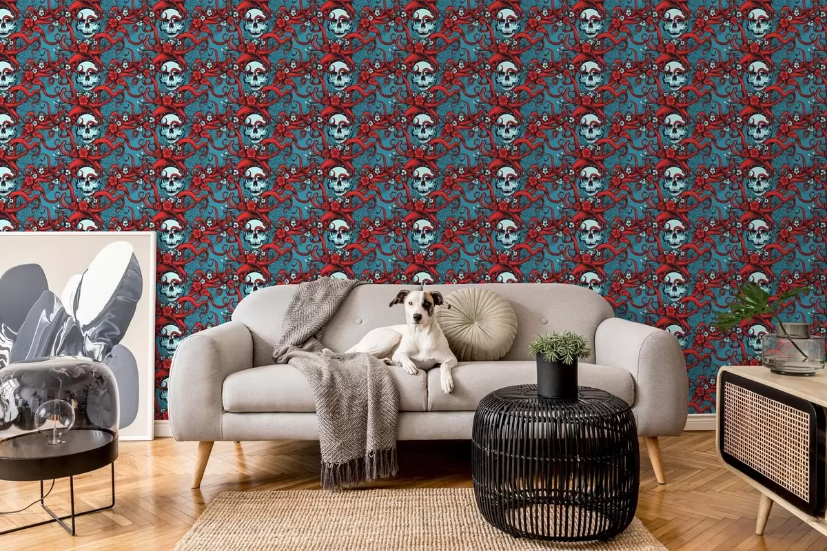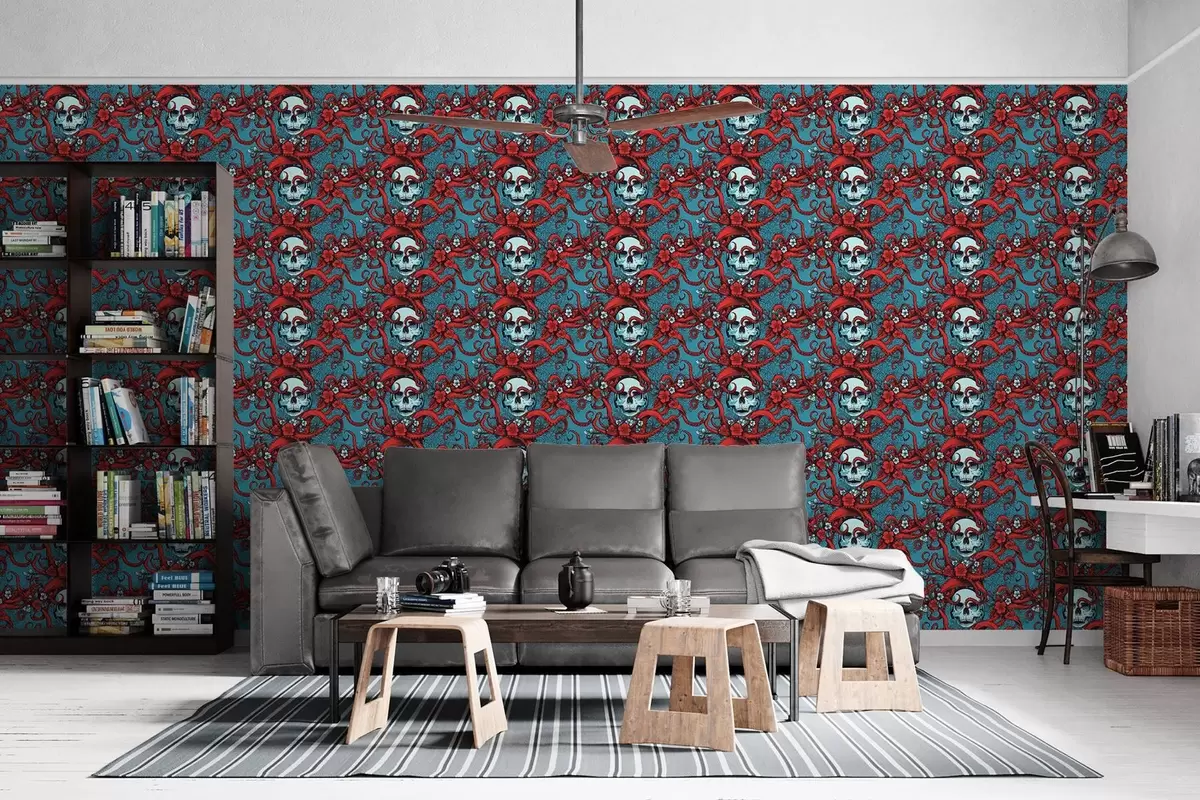 Fototapetai Mistinis raštas su kaukolėmis ir raudonais aštuonkojo čiuptuvais turkio spalvos fone Nr. w02123
