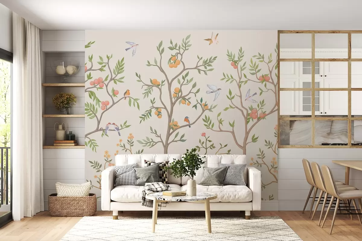 Fototapetai Chinoiserie dizainas su paukščiais, vijokliais, vaisiais ir gėlėmis Nr. w02128