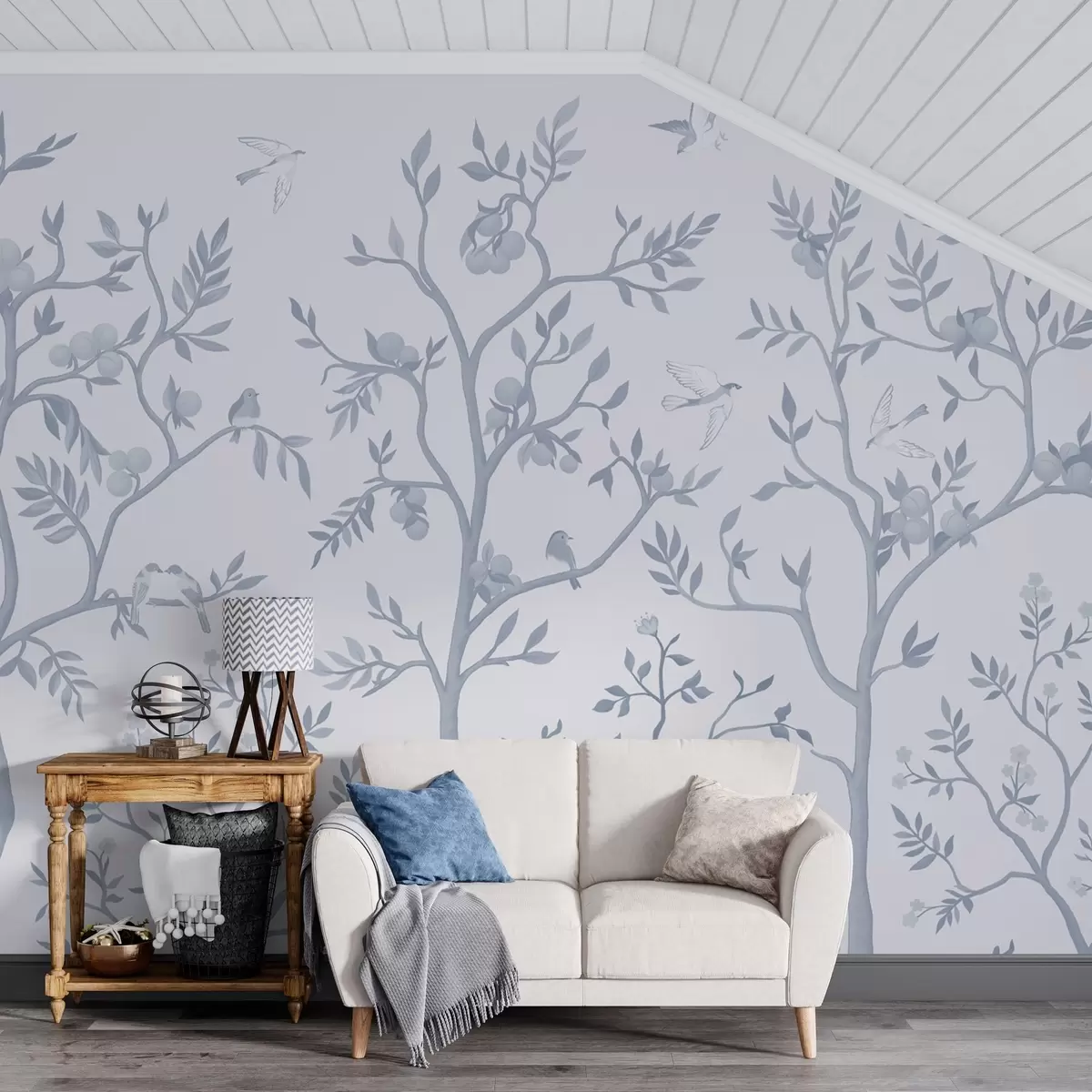 Fototapetai Mėlynos spalvos chinoiserie dizainas su paukščiais, vijokliais, vaisiais ir gėlėmis Nr. w02128v2