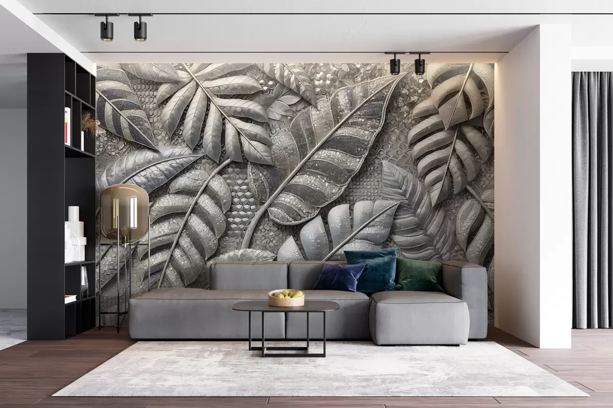 Fototapetai Dideli atogrąžų lapai, švelnių sidabro atspalvių, faktūrinės mozaikos stiliaus Nr. w02135