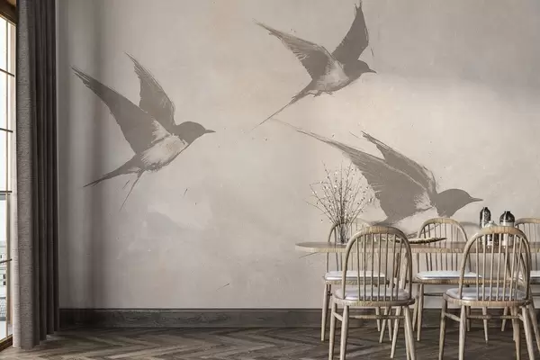 Fototapetai Skraidantys paukščiai, žvirbliai, piešinys tušu, minimalizmas, smėlio spalvos Nr. w02151