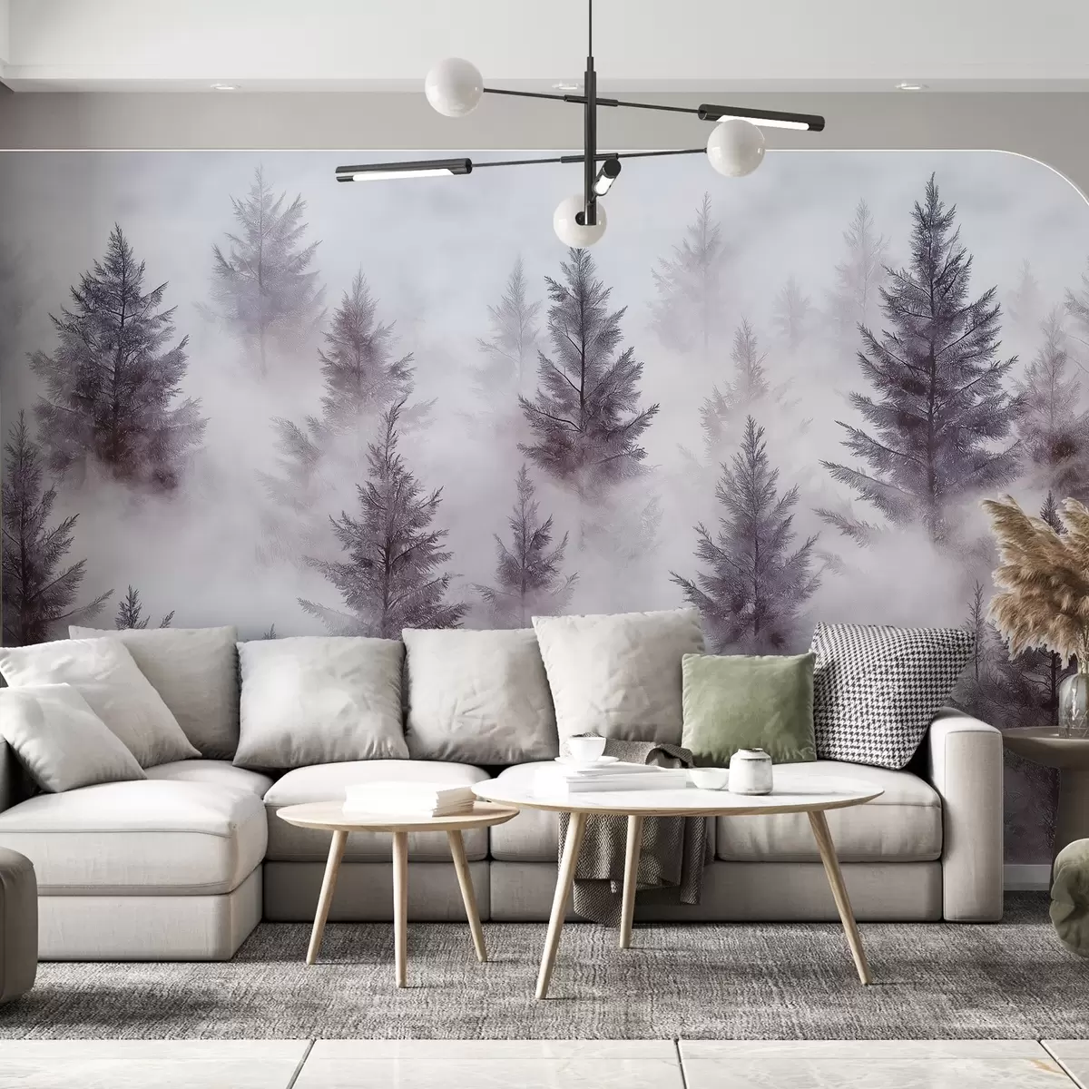 Fototapetai Gražus miškas su pušimis, rūkas, gamtos peizažai, violetinės spalvos Nr. w02222v1