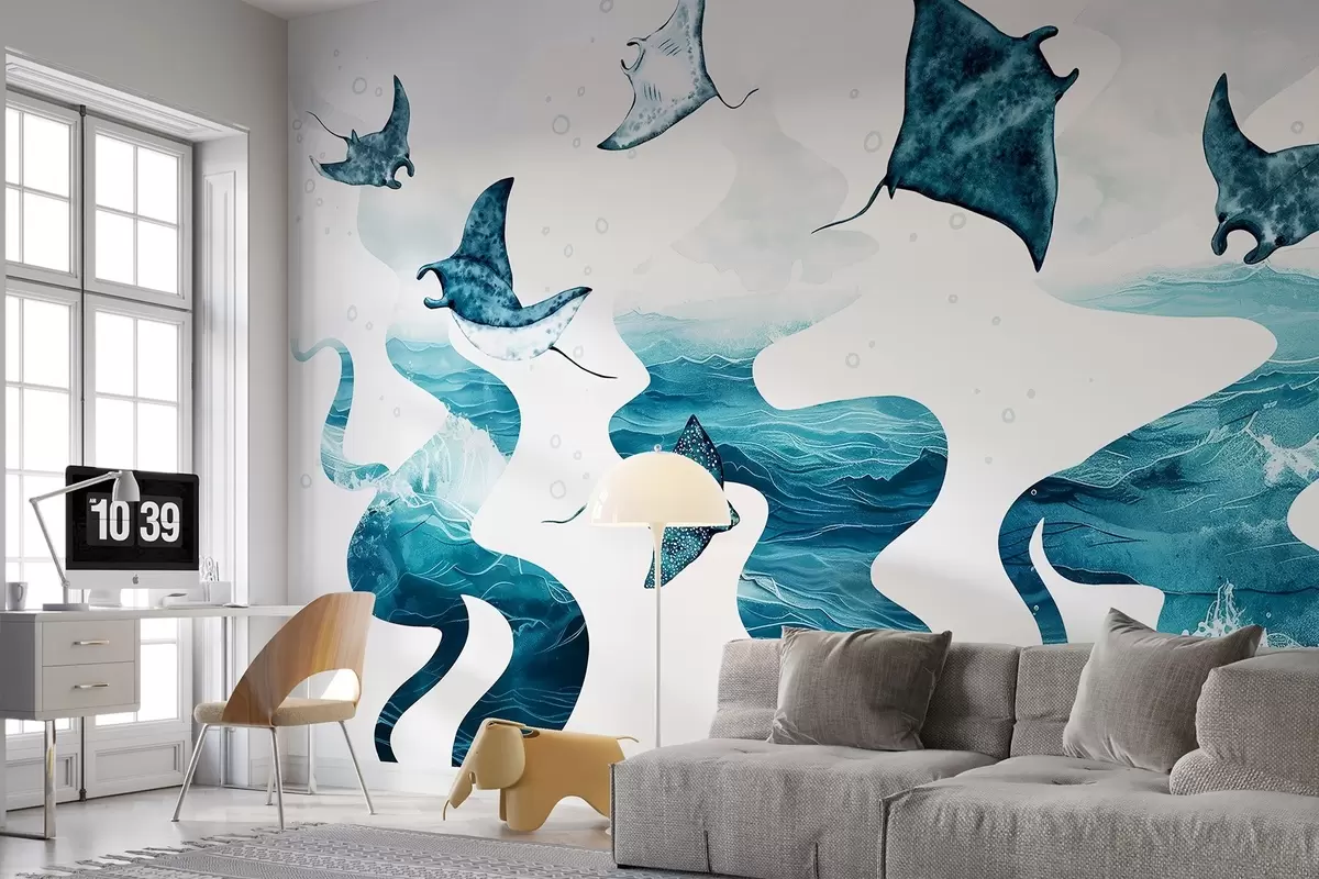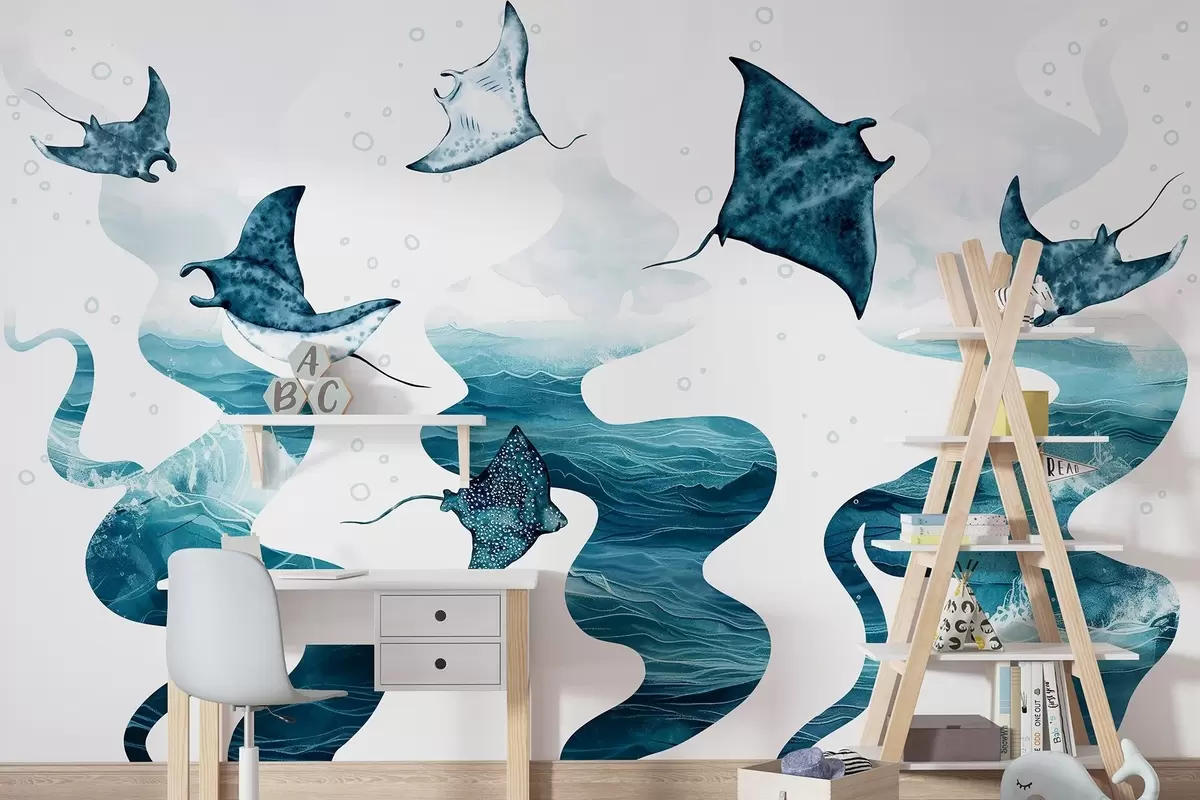 Fototapetai Manta ray žuvys, akvarelės stilius, jūra, vandenynas, mėlynos spalvos Nr. w02266