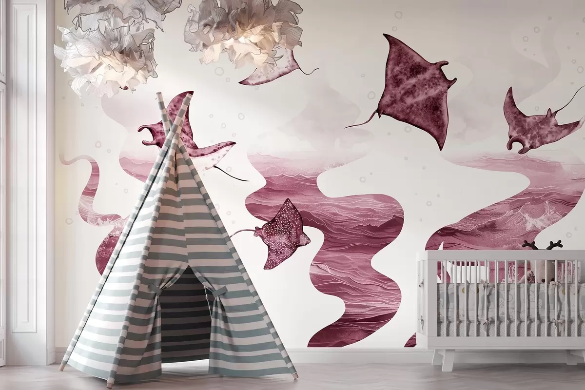 Fototapetai Manta ray žuvys, akvarelės stilius, jūra, vandenynas, rožinės spalvos Nr. w02266v3